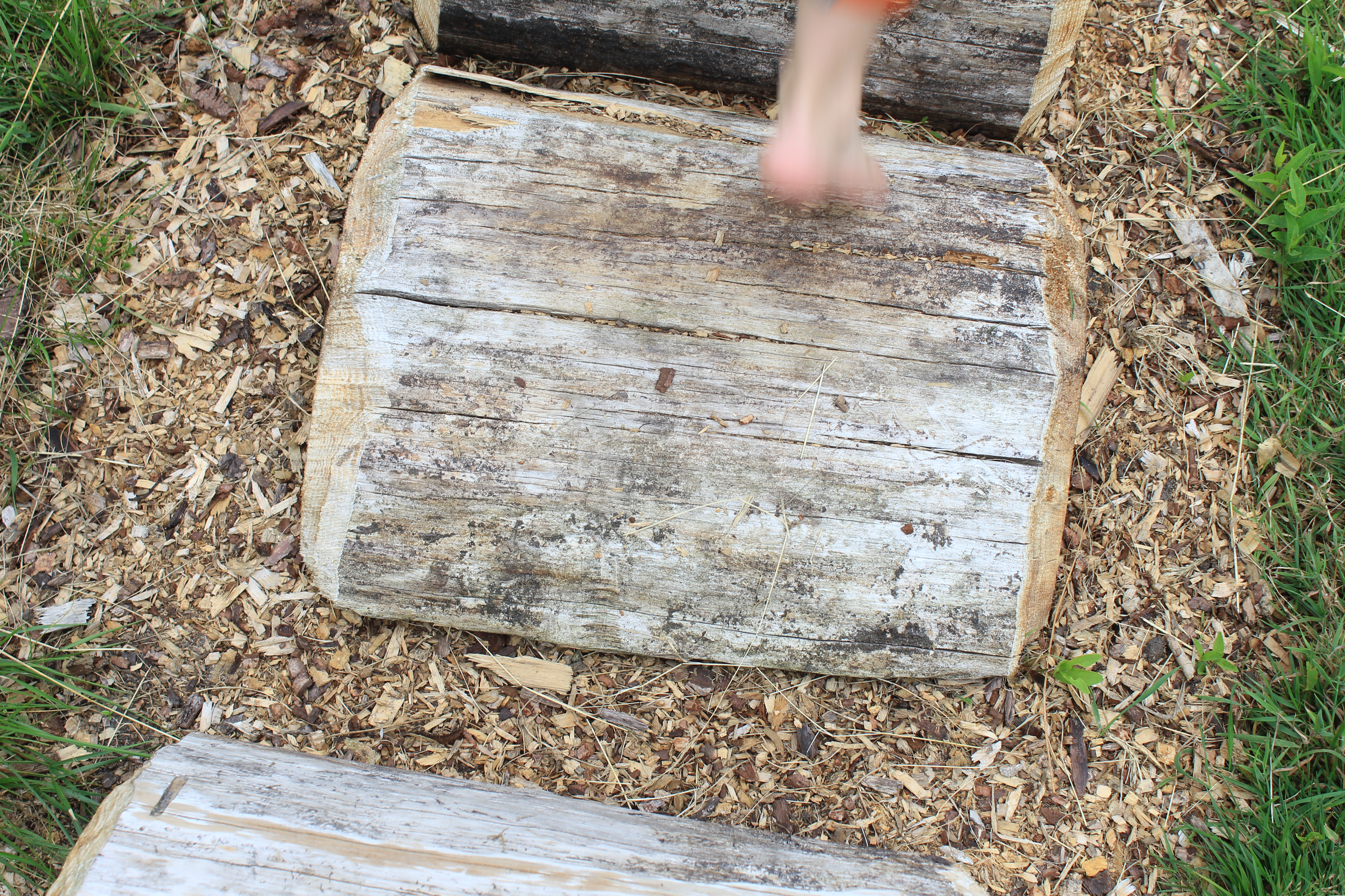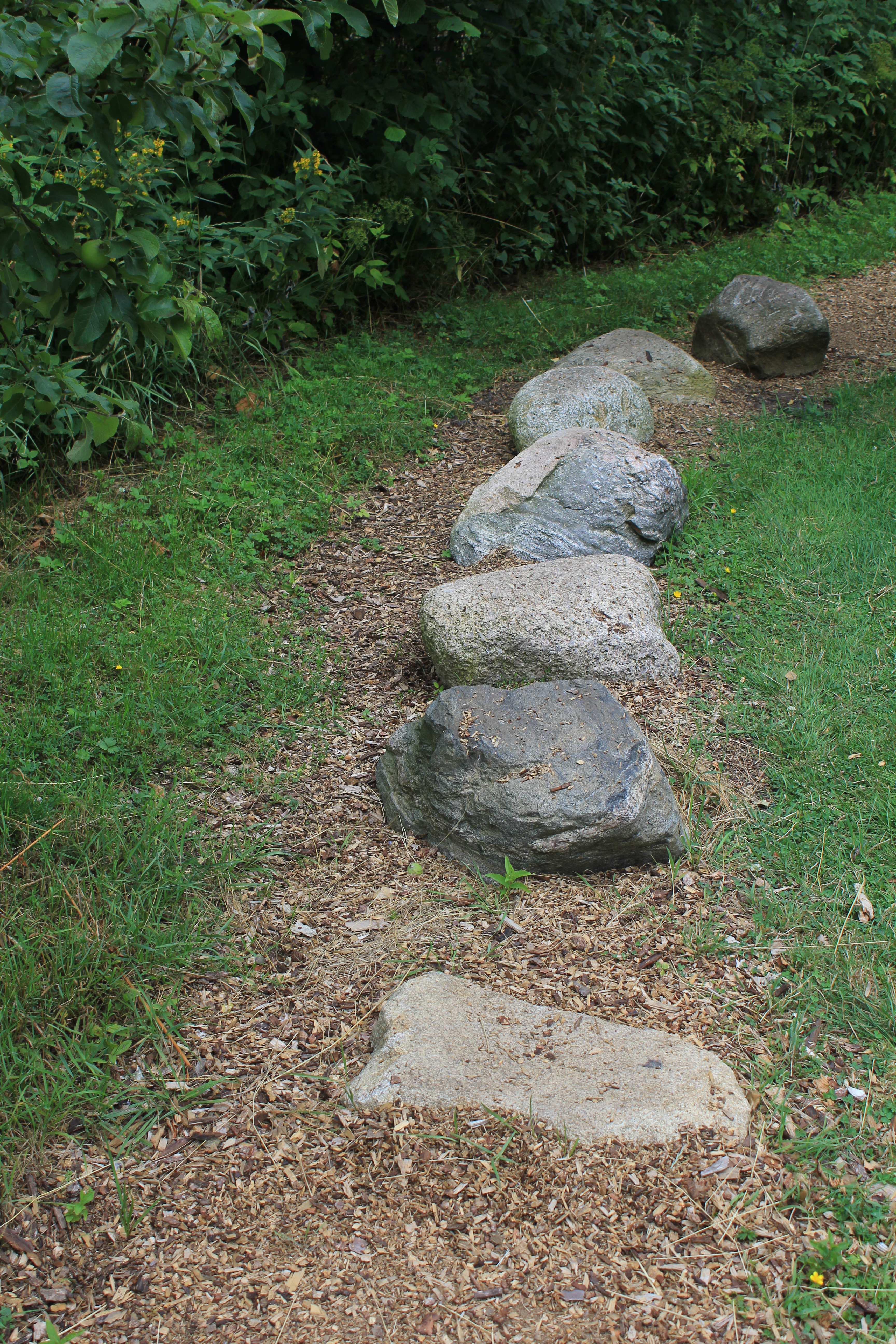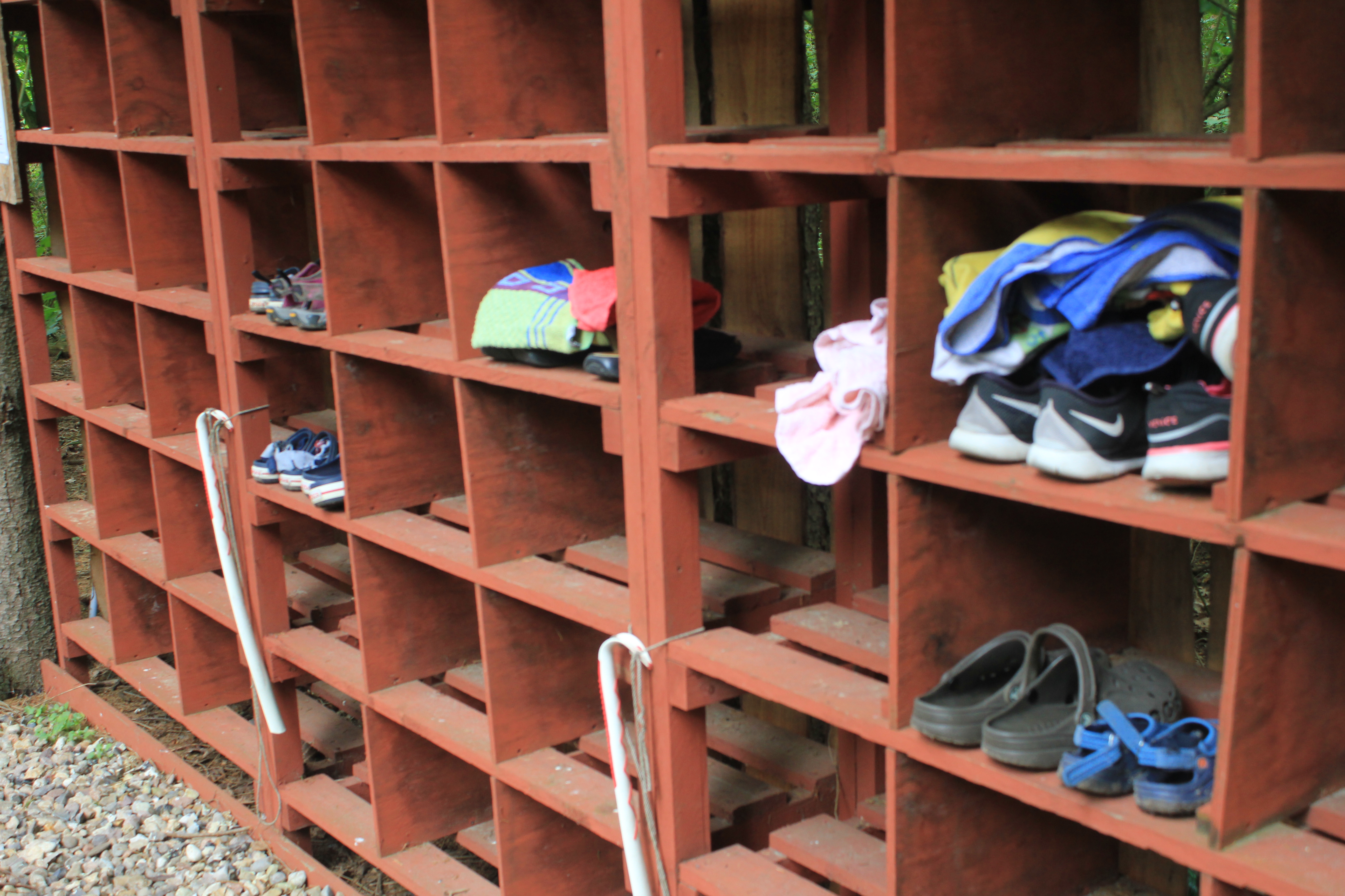 Endlich in Todesfelde angekommen suchten wir uns ein nettes überdachtes Plätzchen, denn das Wetter wusste noch nicht so genau, was es tun wollte. Nach einer kurzen Begrüßung und Einweisung von Susanne, die gemeinsam mit Holger diesen Barfußpark ins Leben gerufen hat, flitzten alle Mädels los zum großen roten Regal, in das man seine Schuhe und ein Handtuch deponieren kann, wenn man denn beides hat. Ich hatte nicht. 🙂 Gestartet wird die wirklich große Runde auf diesem riesigen Grundstück in einem schattig gelegenen Kneippbecken. Ein paar Schreie waren hörbar ob der Kälte des Wassers, und dann gings los.