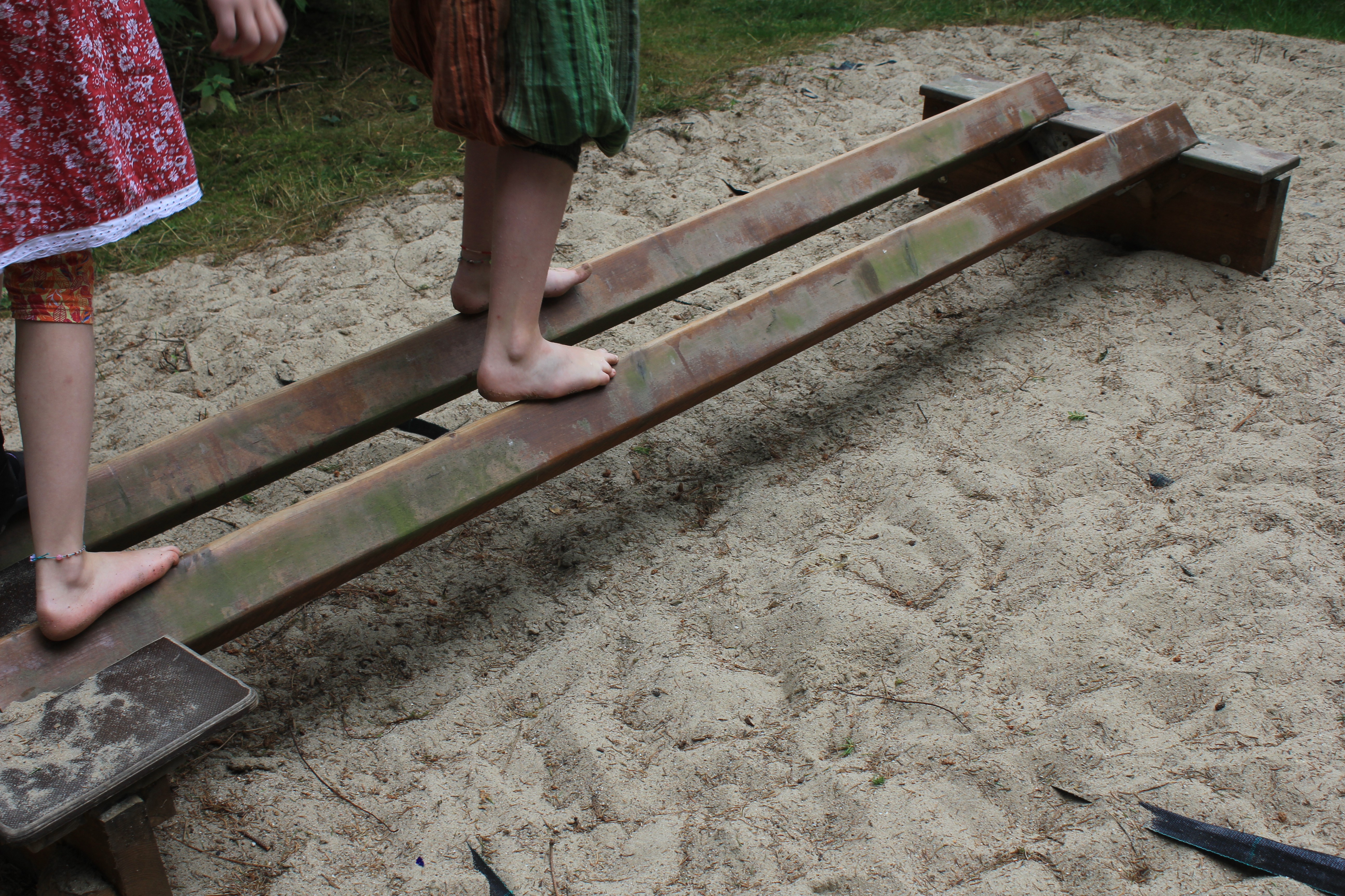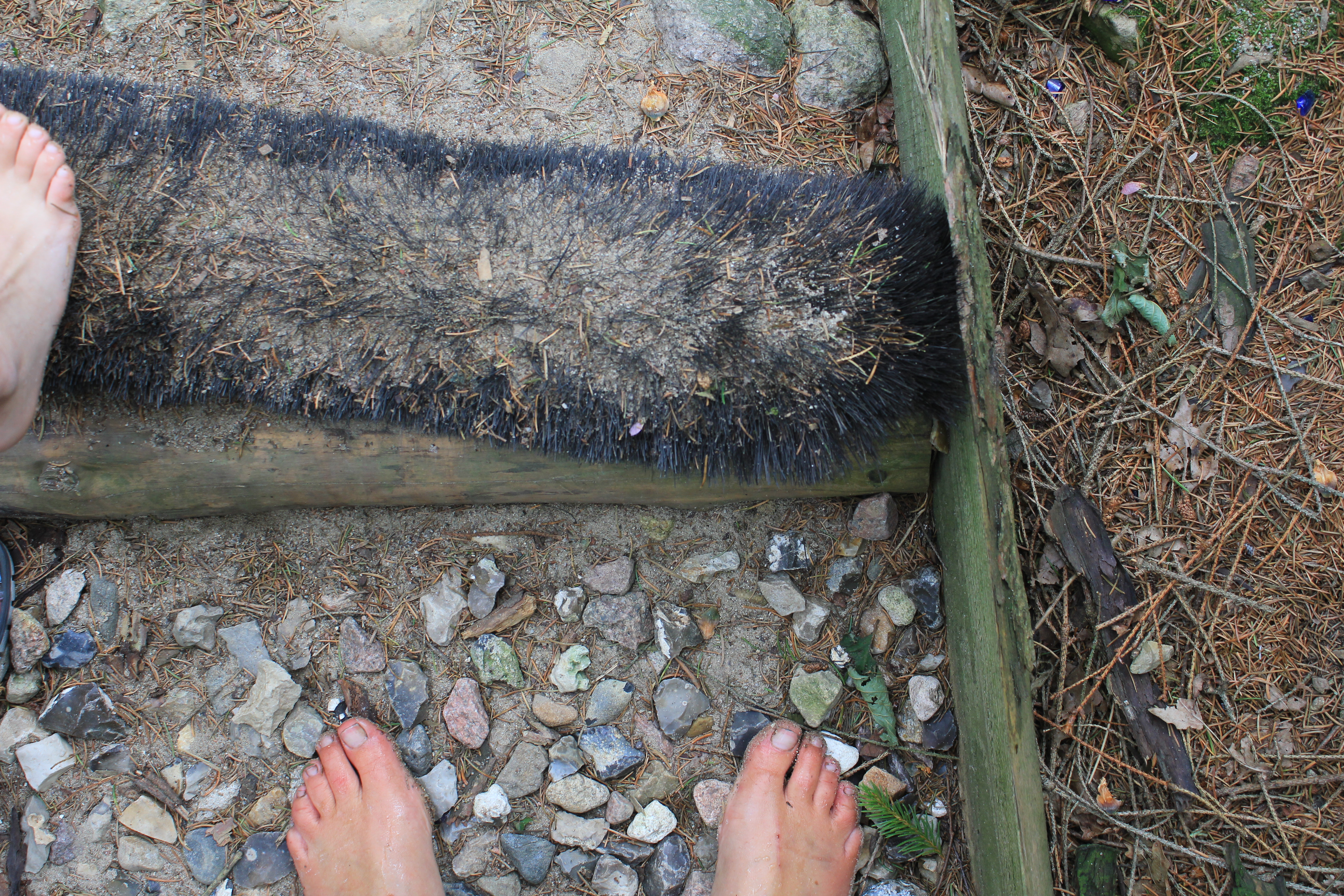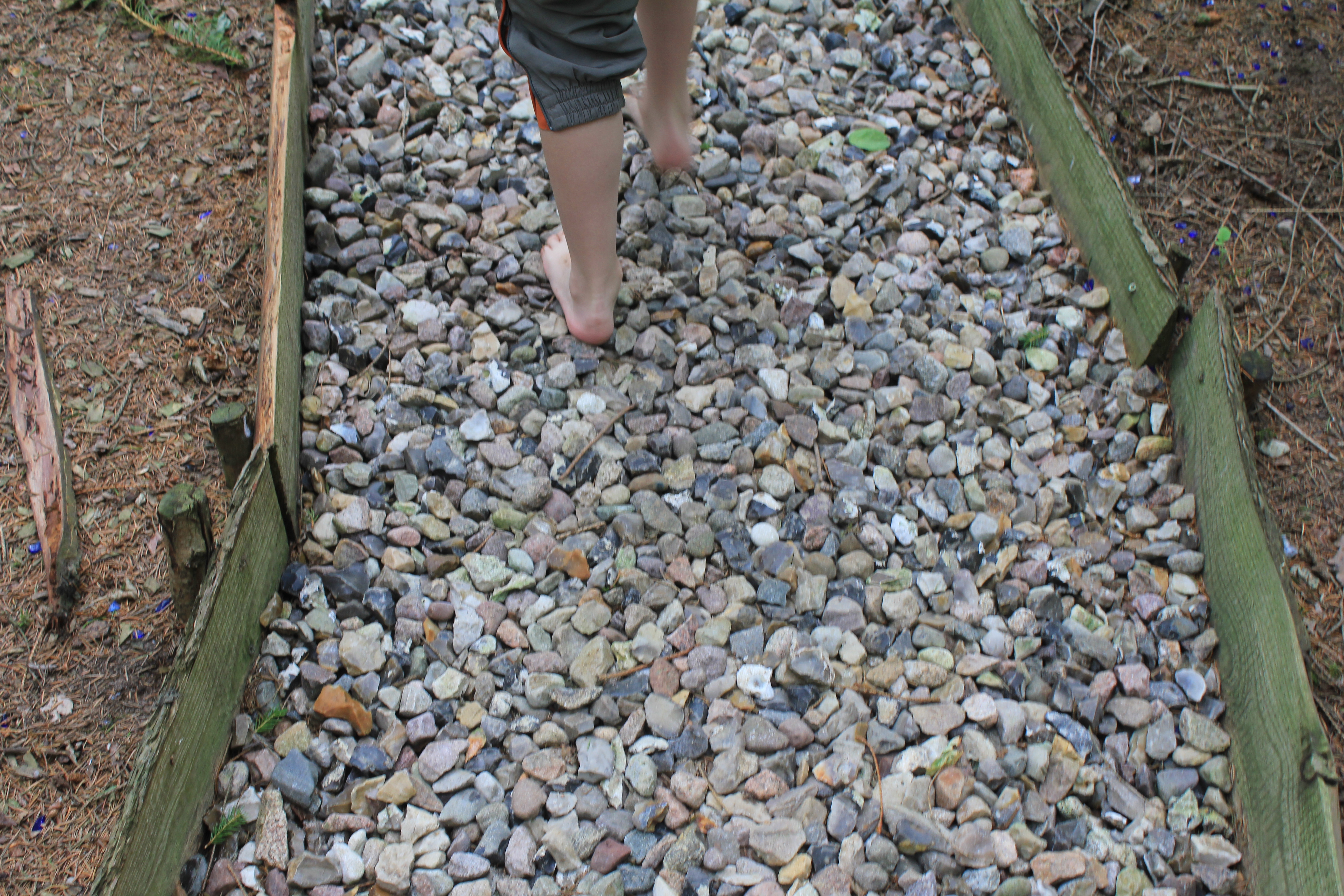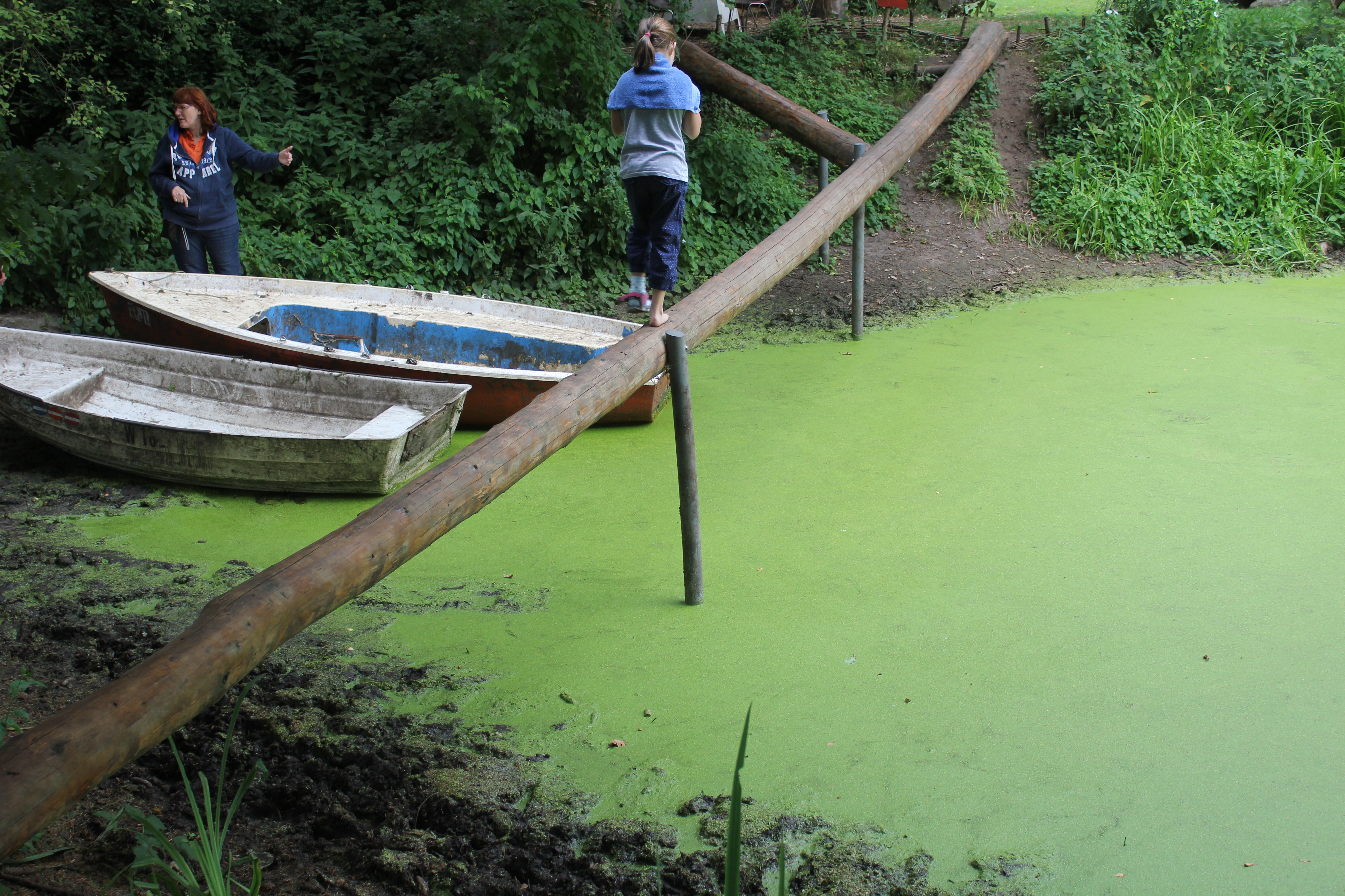 Über Steine, Tannenzapfen, Korken, Äste, Humus, Waldboden, ein Netz, Muscheln, Holzscheiben, Dachpfannen, Holzstämme, Rindenmulch, Schotter, Kiesel, Sand, Wiese und vieles mehr. Immer entlang den blauen Füßen, die als Wegweiser dienen. Die später auftauchenden roten Fußwegweiser deuten darauf hin, dass es etwas wackeliger oder heikler werden kann, dann sucht man sich aus, ob man lieber blau oder rot weitergeht. Über Brücken und hängende Wackelbaumstämme durch drei hintereinander liegende Wasserbecken, die mit Seesand, mit Lehm und mit Moor gefüllt sind. Genau in der Reihenfolge, Moor und Seesand vom eigenen Grundstück. Diese drei Becken sind das Paradies für Barfußfans. Ganz besonders das letzte. 30 cm tief watet man durchs Moor, und natürlich bleibt davon was an einem hängen. Stiefelhoch voll Moor laufen die Mädels weiter. Nicht alle sind beim ersten Durchgang auch durchgegangen. Am Ende waren sie alle drin. Weiter gehts über Glasscherben und Eisenbahnschienen durch drei Maurerbütten, die nicht nur mit Wasser sondern auch noch mit Fußmatten und Bürstenmatten bestückt sind. Es reicht aus, einmal durch die „Fußwaschanlage“ zu gehen und die Füße sind fast so sauber wie zu Anfang der Runde.