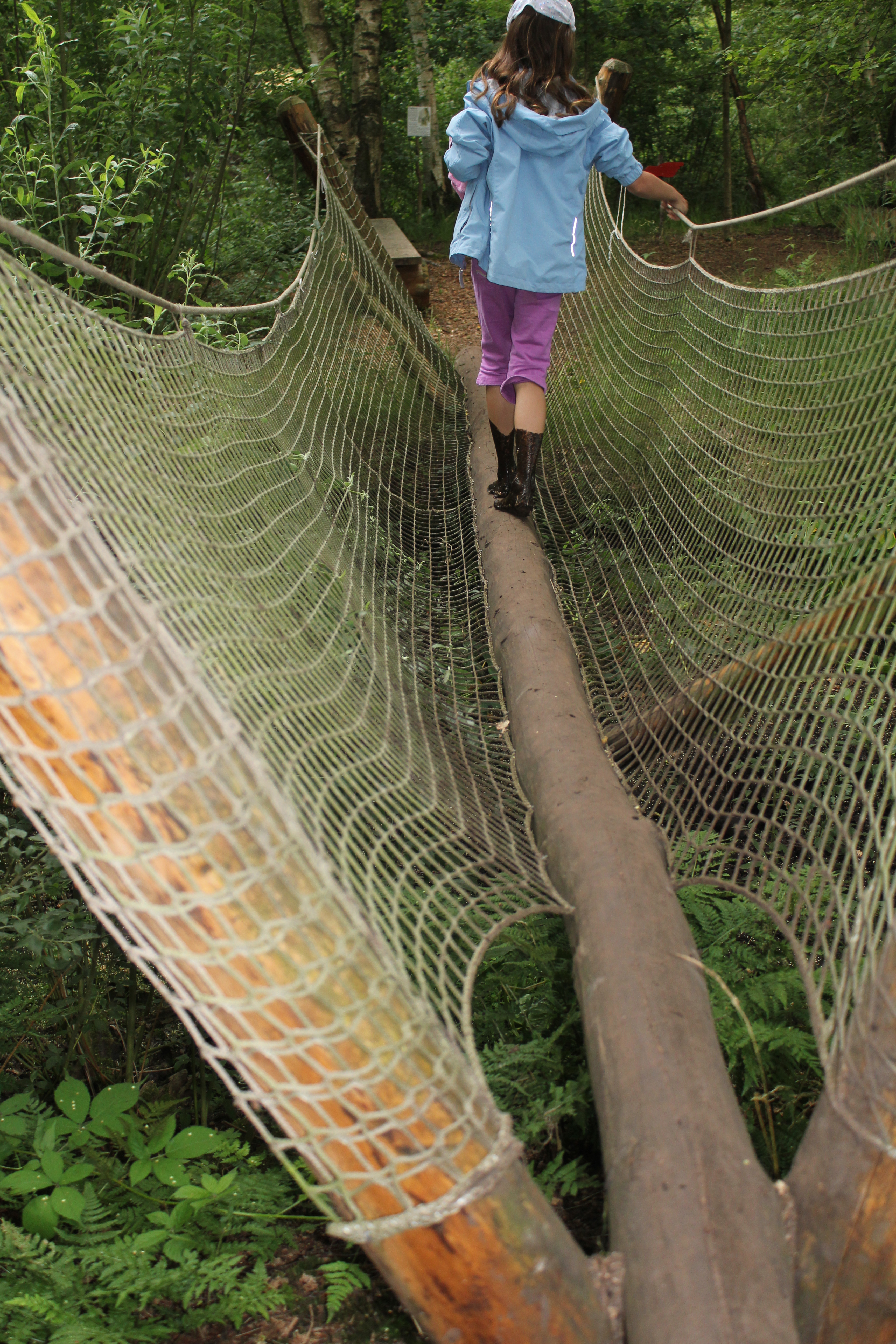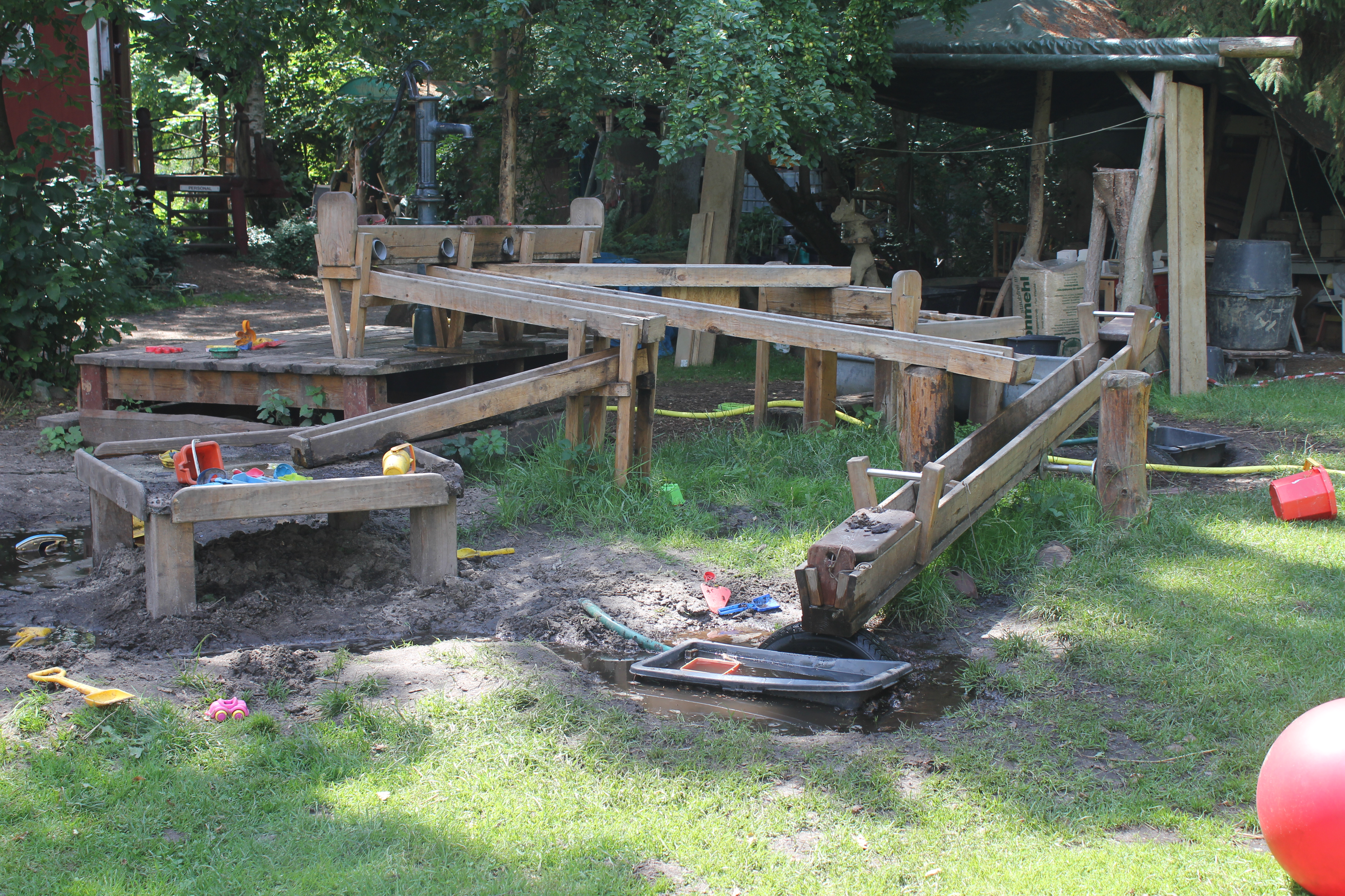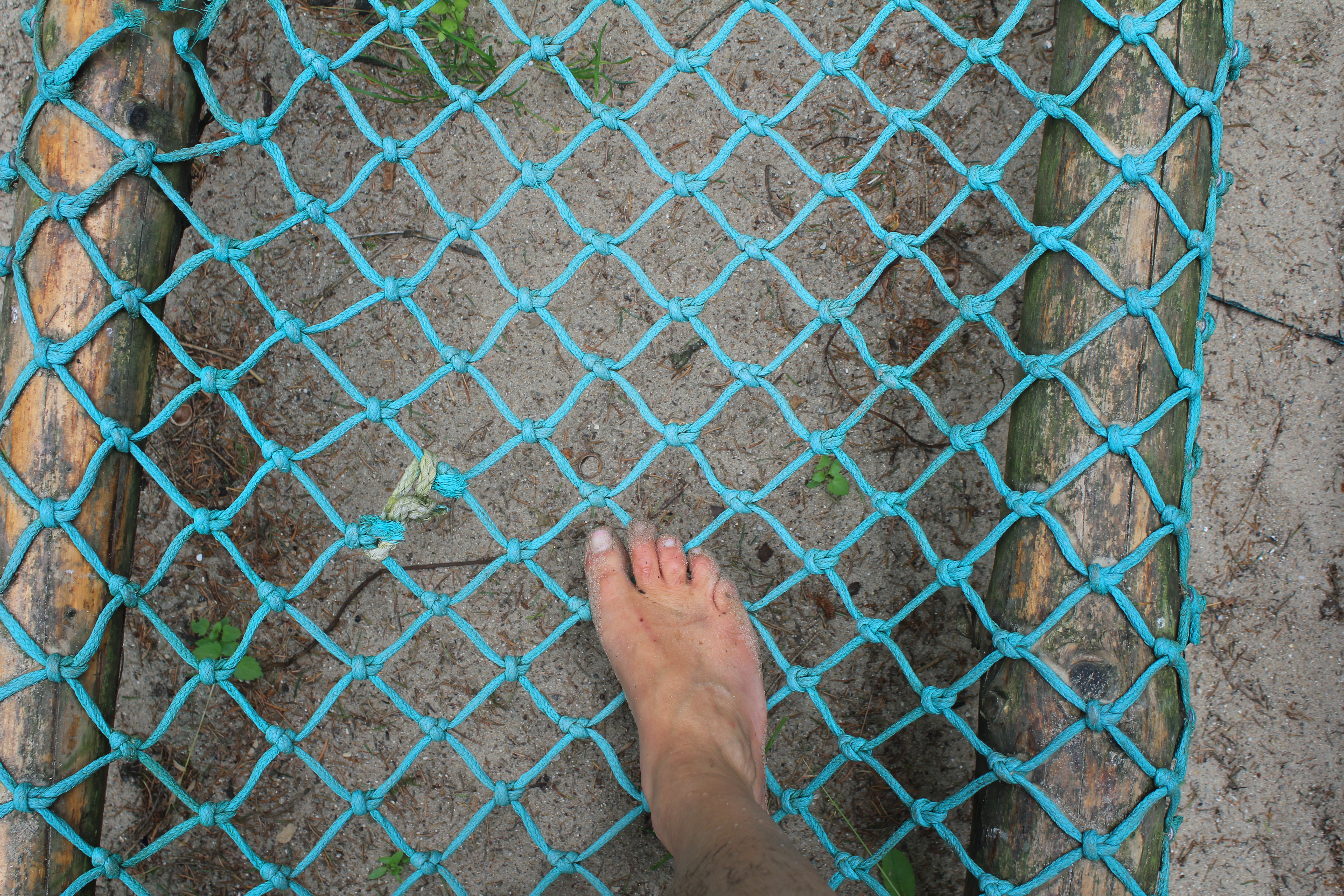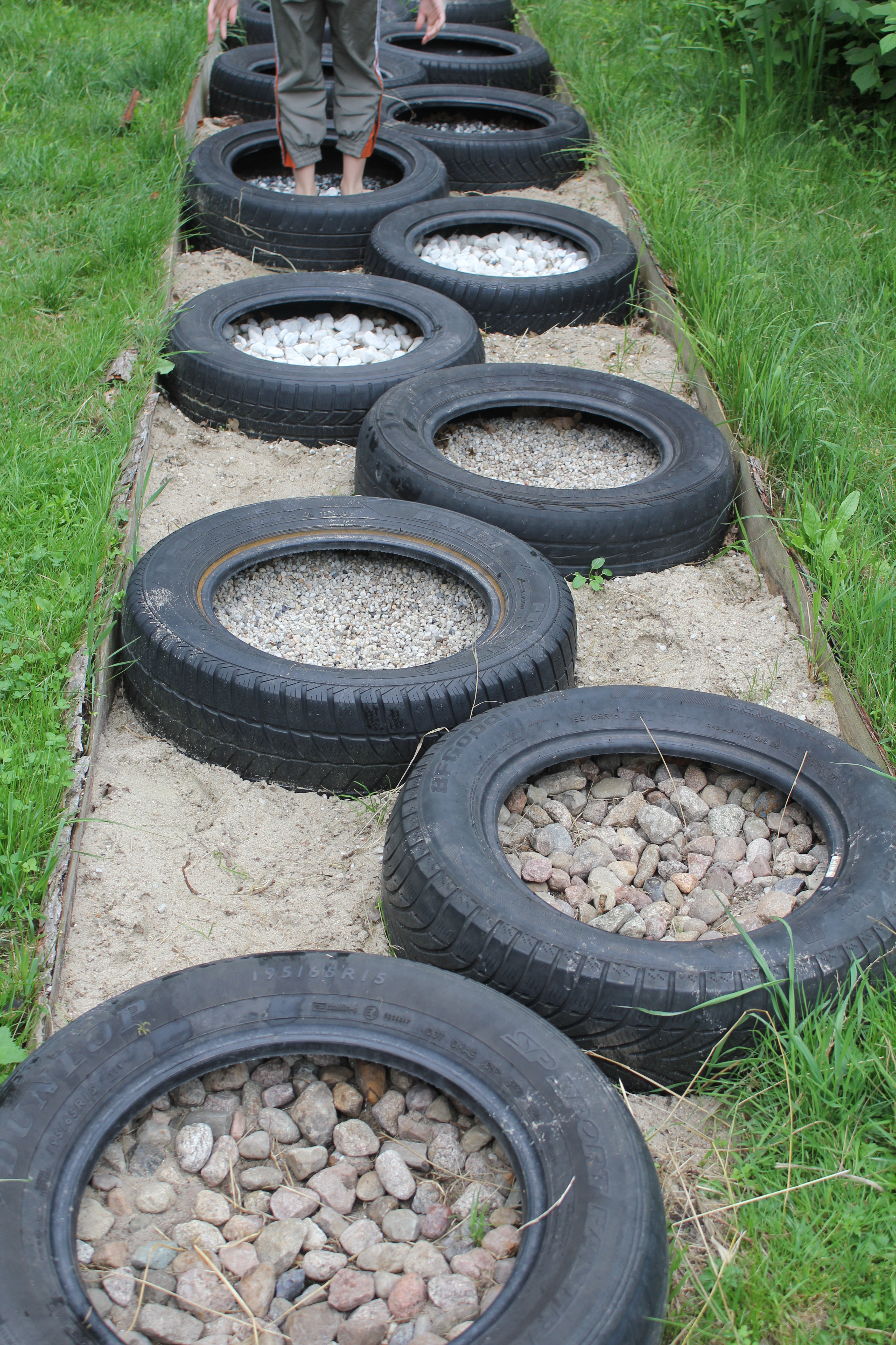 Über Steine, Tannenzapfen, Korken, Äste, Humus, Waldboden, ein Netz, Muscheln, Holzscheiben, Dachpfannen, Holzstämme, Rindenmulch, Schotter, Kiesel, Sand, Wiese und vieles mehr. Immer entlang den blauen Füßen, die als Wegweiser dienen. Die später auftauchenden roten Fußwegweiser deuten darauf hin, dass es etwas wackeliger oder heikler werden kann, dann sucht man sich aus, ob man lieber blau oder rot weitergeht. Über Brücken und hängende Wackelbaumstämme durch drei hintereinander liegende Wasserbecken, die mit Seesand, mit Lehm und mit Moor gefüllt sind. Genau in der Reihenfolge, Moor und Seesand vom eigenen Grundstück. Diese drei Becken sind das Paradies für Barfußfans. Ganz besonders das letzte. 30 cm tief watet man durchs Moor, und natürlich bleibt davon was an einem hängen. Stiefelhoch voll Moor laufen die Mädels weiter. Nicht alle sind beim ersten Durchgang auch durchgegangen. Am Ende waren sie alle drin. Weiter gehts über Glasscherben und Eisenbahnschienen durch drei Maurerbütten, die nicht nur mit Wasser sondern auch noch mit Fußmatten und Bürstenmatten bestückt sind. Es reicht aus, einmal durch die „Fußwaschanlage“ zu gehen und die Füße sind fast so sauber wie zu Anfang der Runde.
