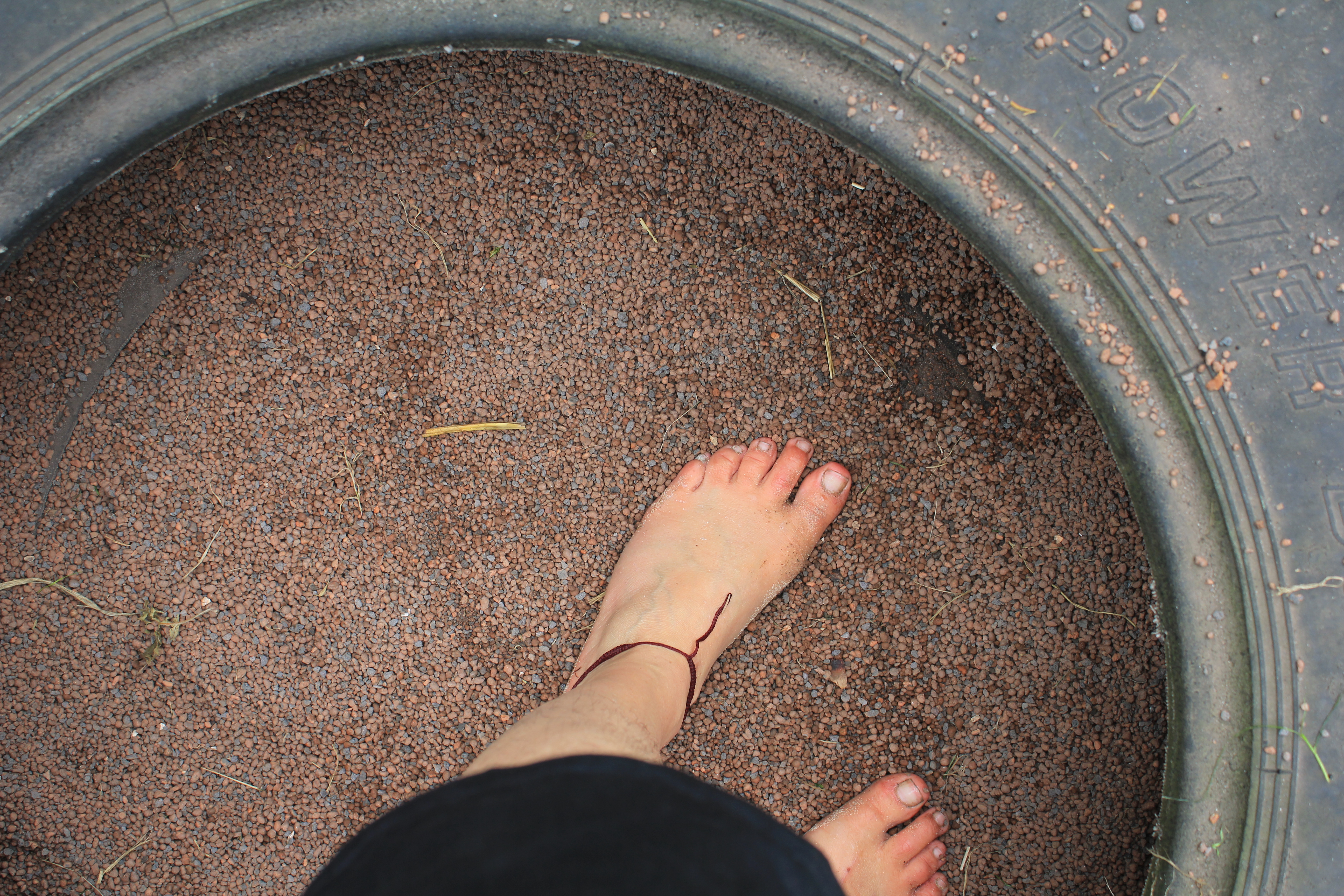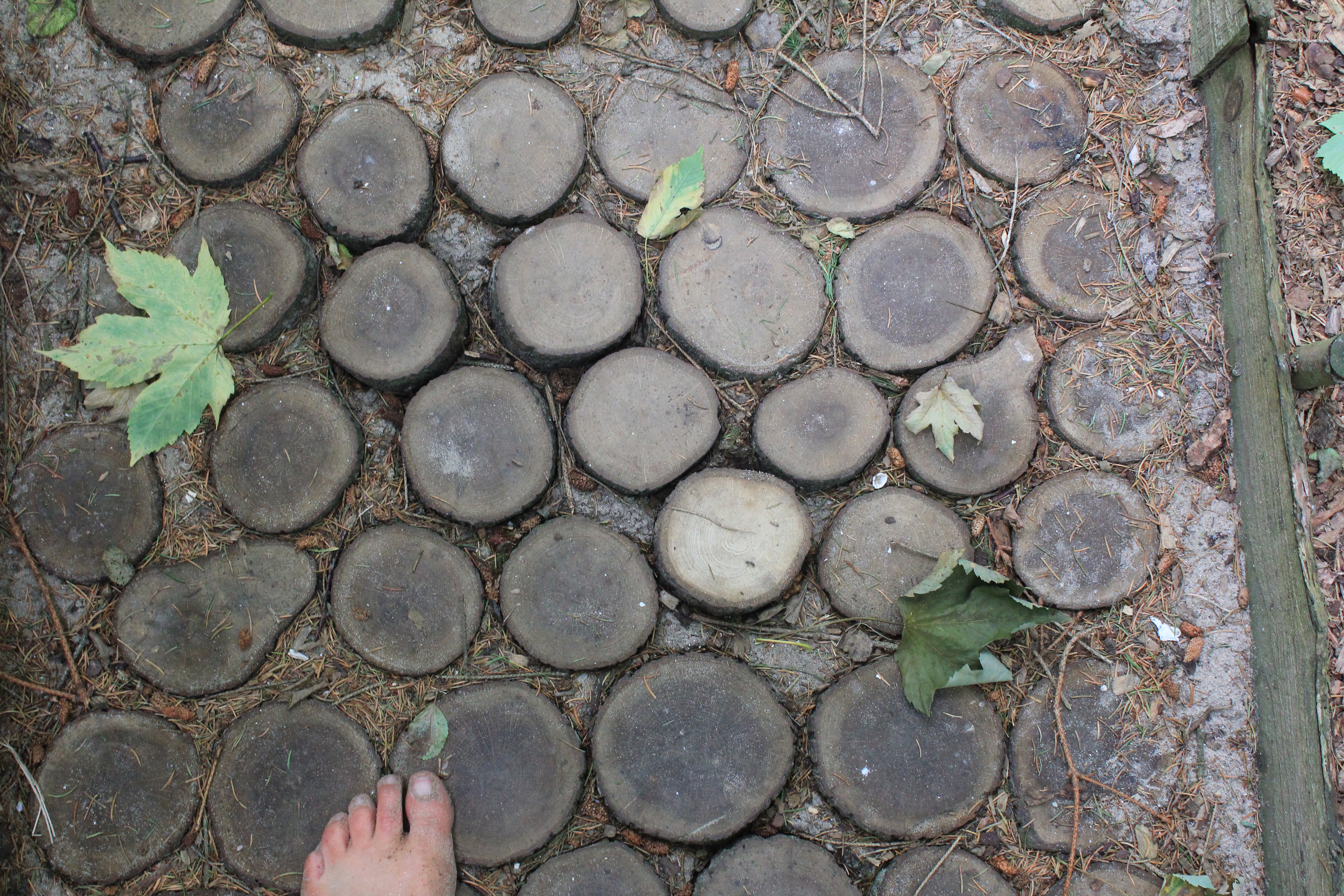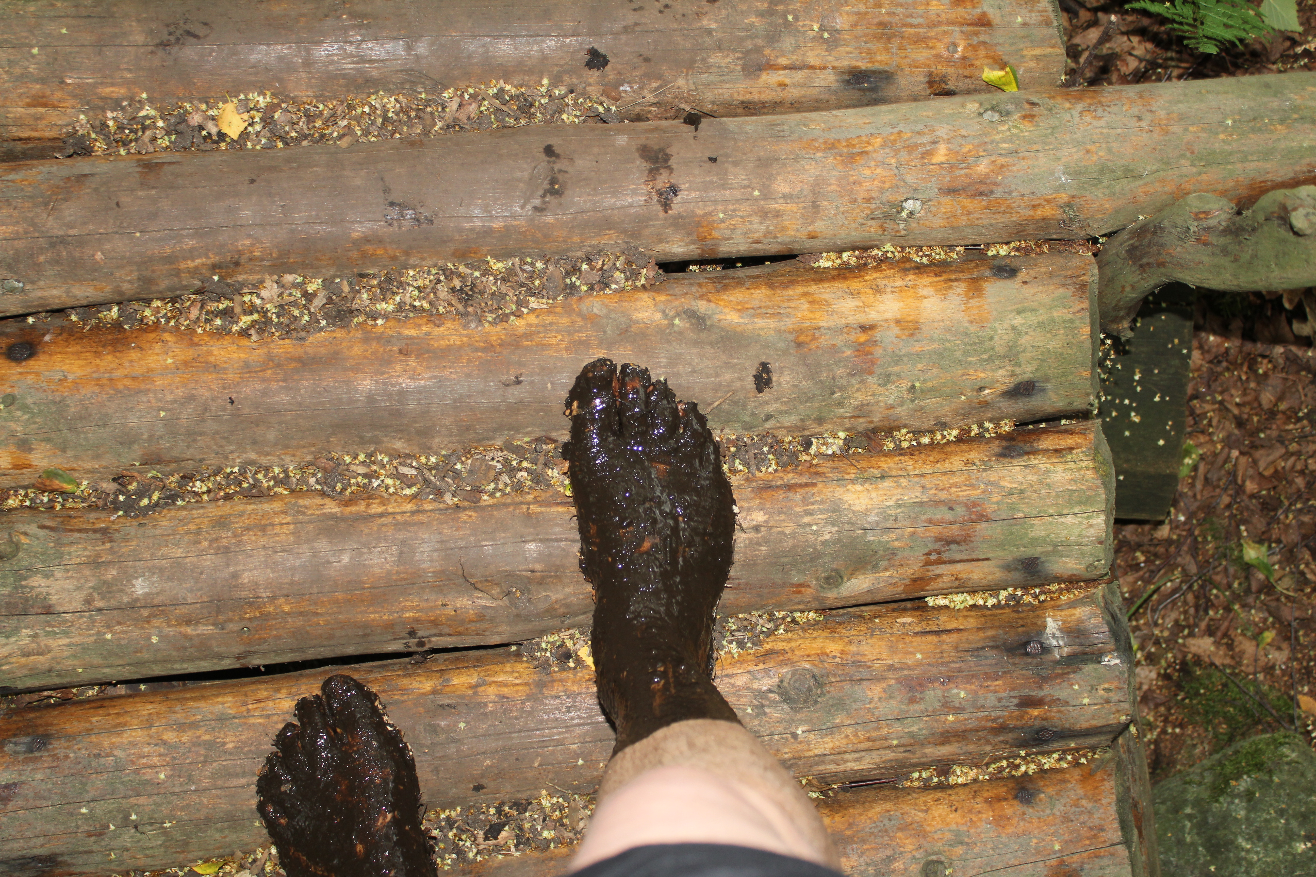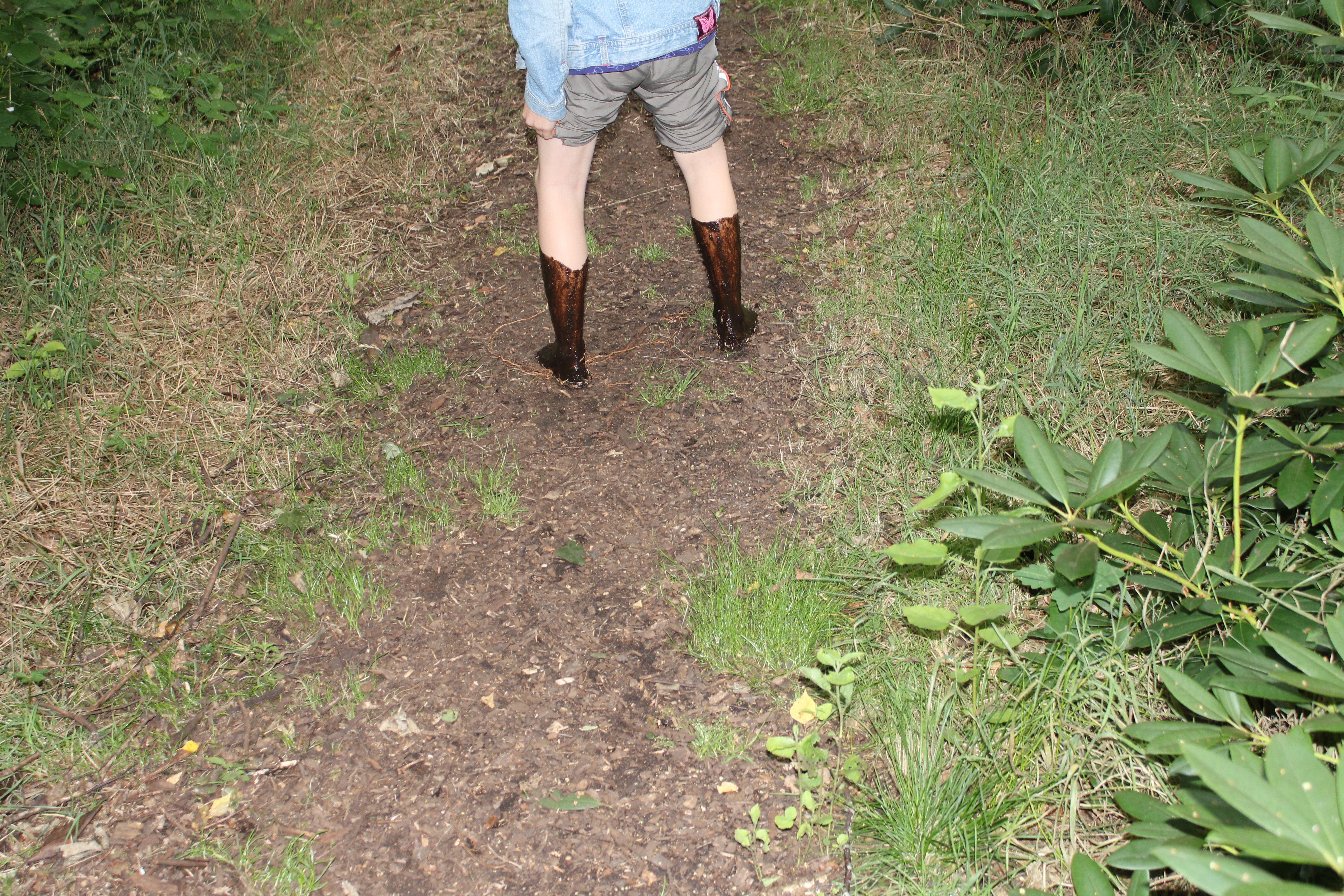 Über Steine, Tannenzapfen, Korken, Äste, Humus, Waldboden, ein Netz, Muscheln, Holzscheiben, Dachpfannen, Holzstämme, Rindenmulch, Schotter, Kiesel, Sand, Wiese und vieles mehr. Immer entlang den blauen Füßen, die als Wegweiser dienen. Die später auftauchenden roten Fußwegweiser deuten darauf hin, dass es etwas wackeliger oder heikler werden kann, dann sucht man sich aus, ob man lieber blau oder rot weitergeht. Über Brücken und hängende Wackelbaumstämme durch drei hintereinander liegende Wasserbecken, die mit Seesand, mit Lehm und mit Moor gefüllt sind. Genau in der Reihenfolge, Moor und Seesand vom eigenen Grundstück. Diese drei Becken sind das Paradies für Barfußfans. Ganz besonders das letzte. 30 cm tief watet man durchs Moor, und natürlich bleibt davon was an einem hängen. Stiefelhoch voll Moor laufen die Mädels weiter. Nicht alle sind beim ersten Durchgang auch durchgegangen. Am Ende waren sie alle drin. Weiter gehts über Glasscherben und Eisenbahnschienen durch drei Maurerbütten, die nicht nur mit Wasser sondern auch noch mit Fußmatten und Bürstenmatten bestückt sind. Es reicht aus, einmal durch die „Fußwaschanlage“ zu gehen und die Füße sind fast so sauber wie zu Anfang der Runde.