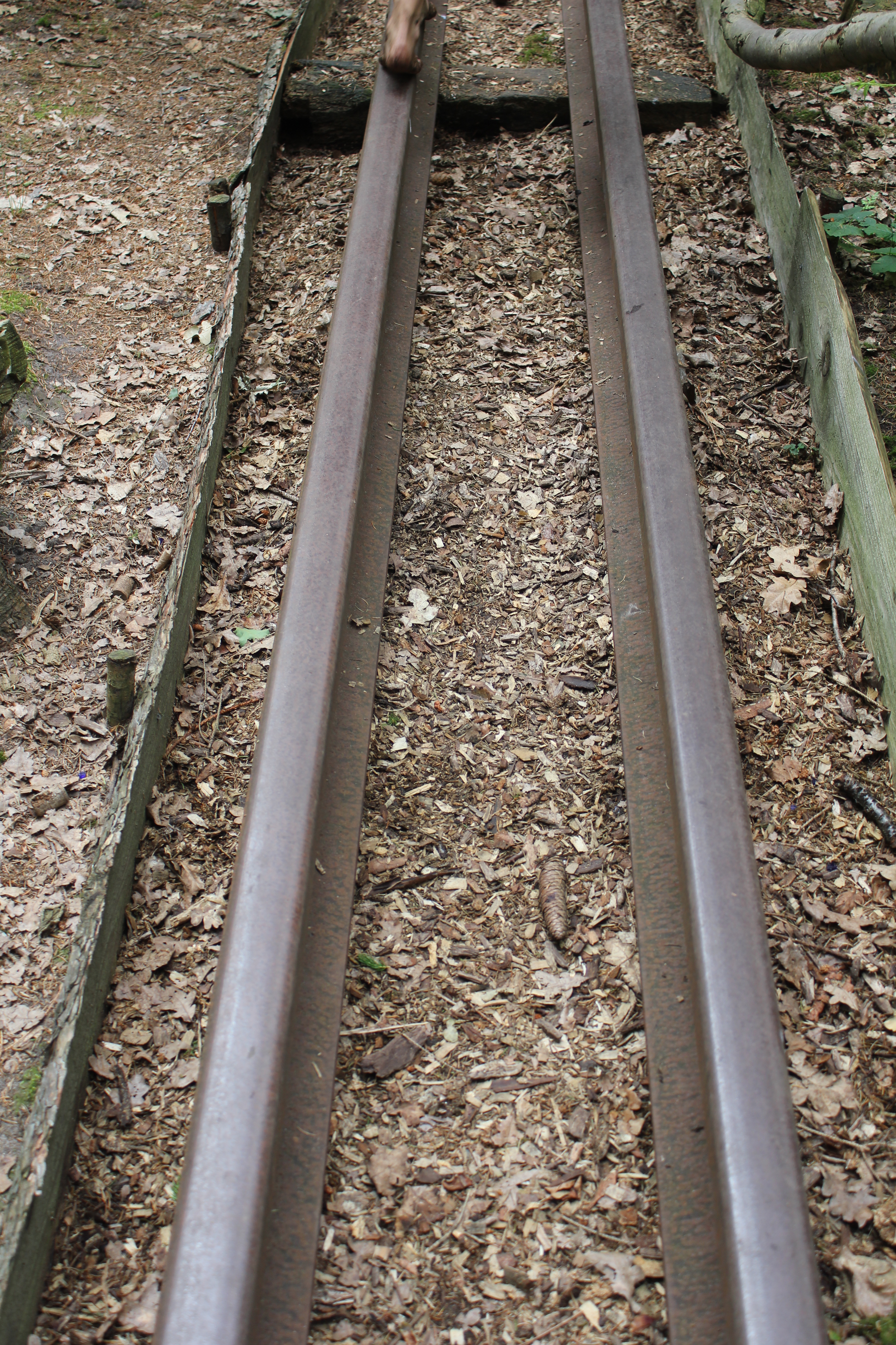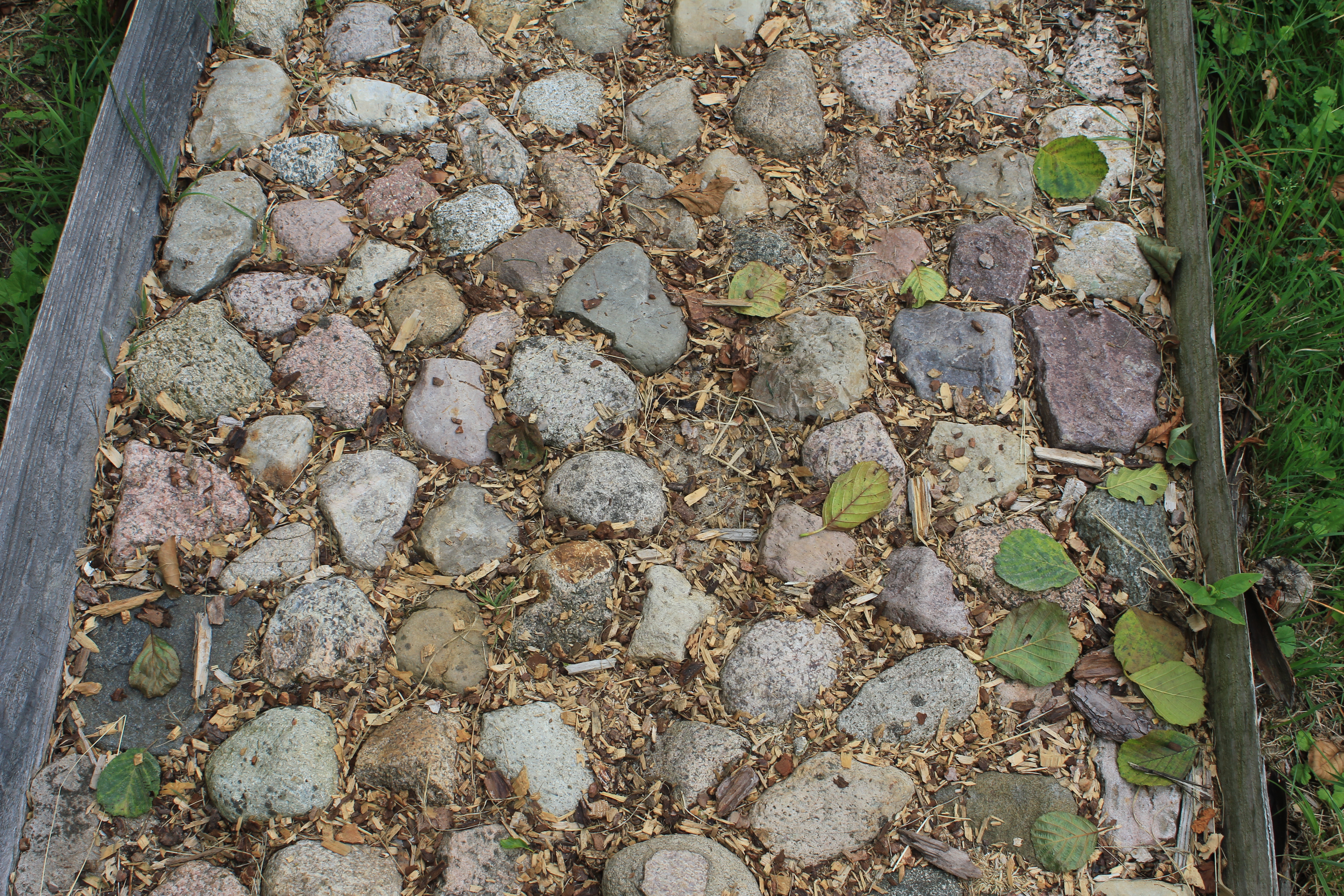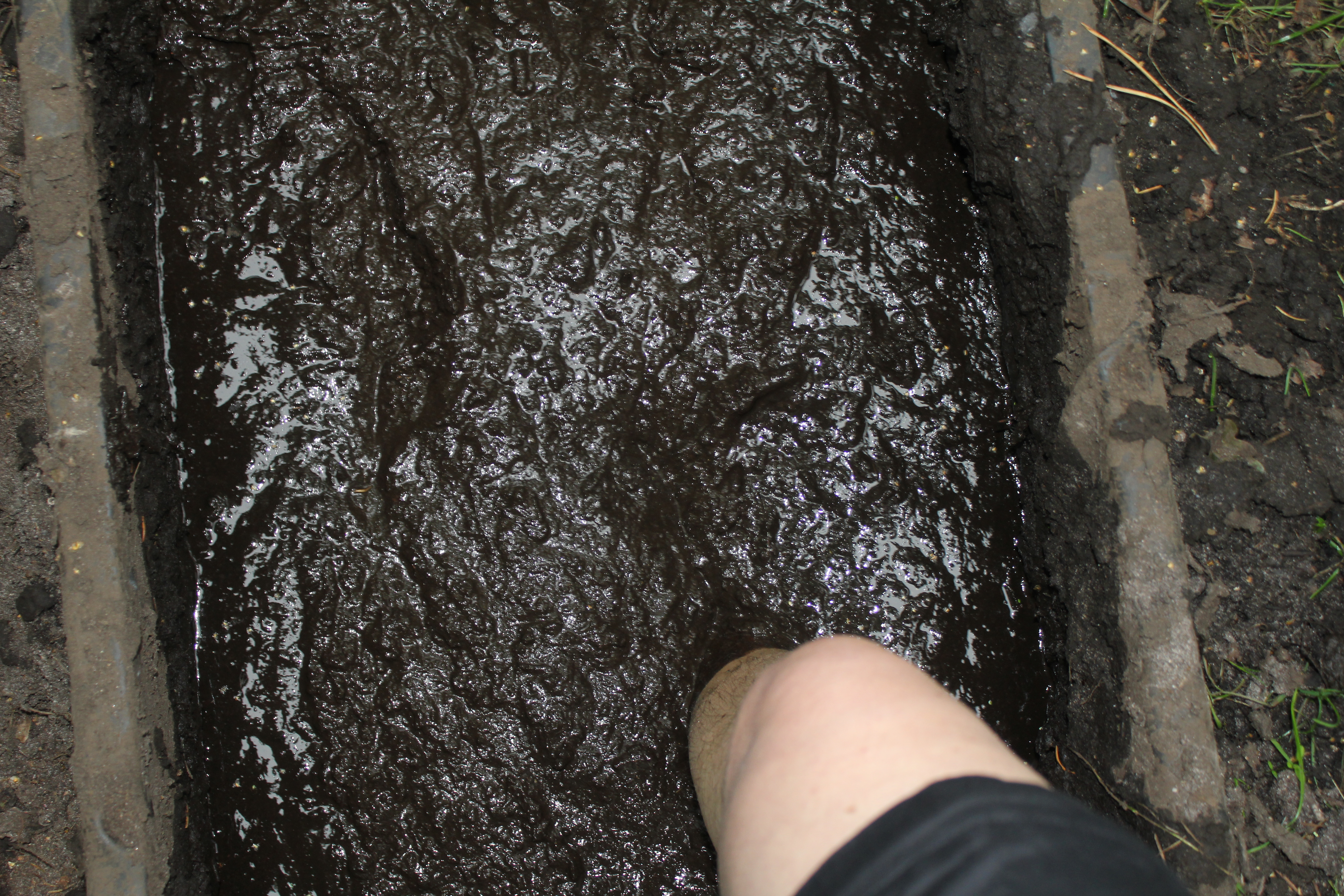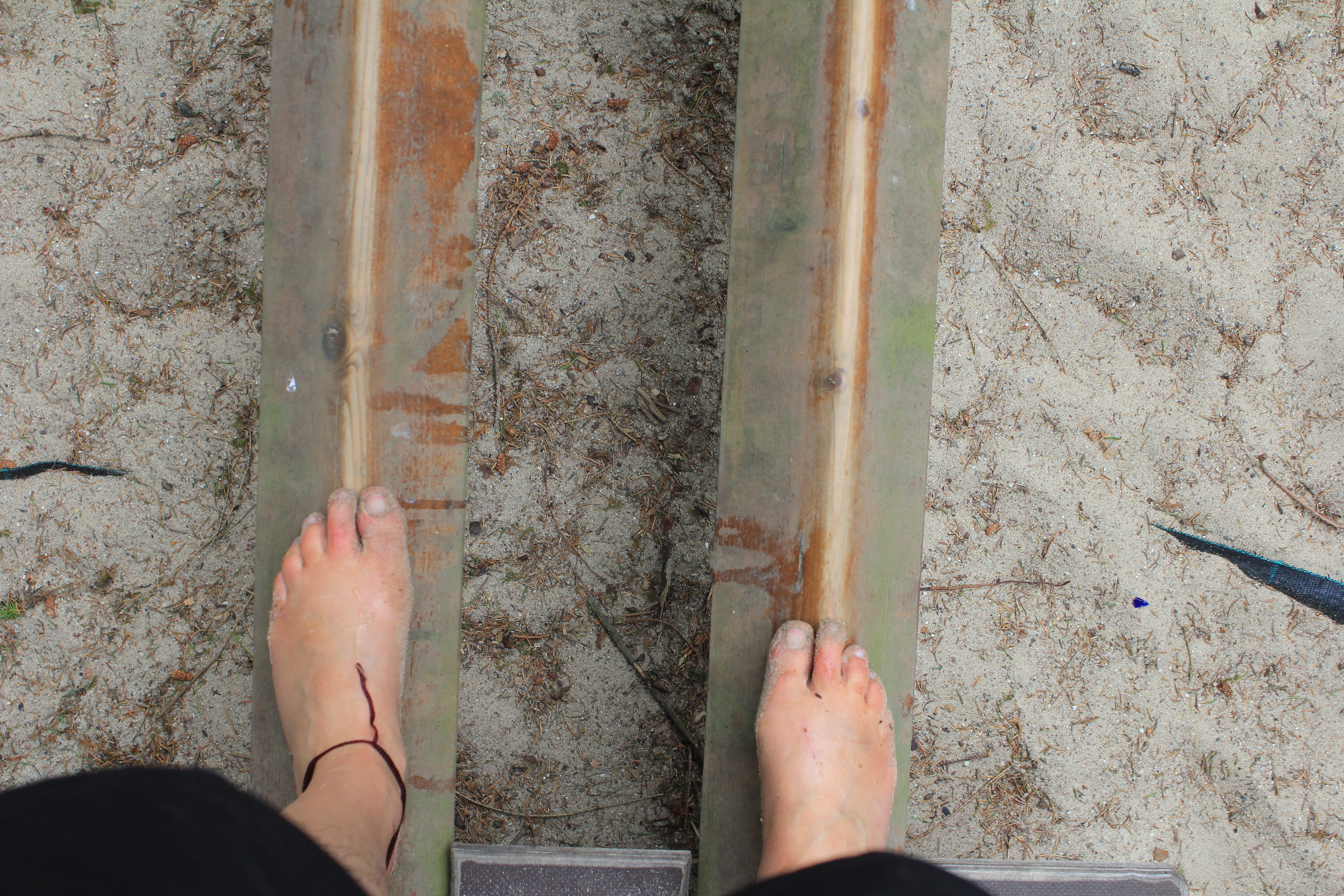 Über Steine, Tannenzapfen, Korken, Äste, Humus, Waldboden, ein Netz, Muscheln, Holzscheiben, Dachpfannen, Holzstämme, Rindenmulch, Schotter, Kiesel, Sand, Wiese und vieles mehr. Immer entlang den blauen Füßen, die als Wegweiser dienen. Die später auftauchenden roten Fußwegweiser deuten darauf hin, dass es etwas wackeliger oder heikler werden kann, dann sucht man sich aus, ob man lieber blau oder rot weitergeht. Über Brücken und hängende Wackelbaumstämme durch drei hintereinander liegende Wasserbecken, die mit Seesand, mit Lehm und mit Moor gefüllt sind. Genau in der Reihenfolge, Moor und Seesand vom eigenen Grundstück. Diese drei Becken sind das Paradies für Barfußfans. Ganz besonders das letzte. 30 cm tief watet man durchs Moor, und natürlich bleibt davon was an einem hängen. Stiefelhoch voll Moor laufen die Mädels weiter. Nicht alle sind beim ersten Durchgang auch durchgegangen. Am Ende waren sie alle drin. Weiter gehts über Glasscherben und Eisenbahnschienen durch drei Maurerbütten, die nicht nur mit Wasser sondern auch noch mit Fußmatten und Bürstenmatten bestückt sind. Es reicht aus, einmal durch die „Fußwaschanlage“ zu gehen und die Füße sind fast so sauber wie zu Anfang der Runde.