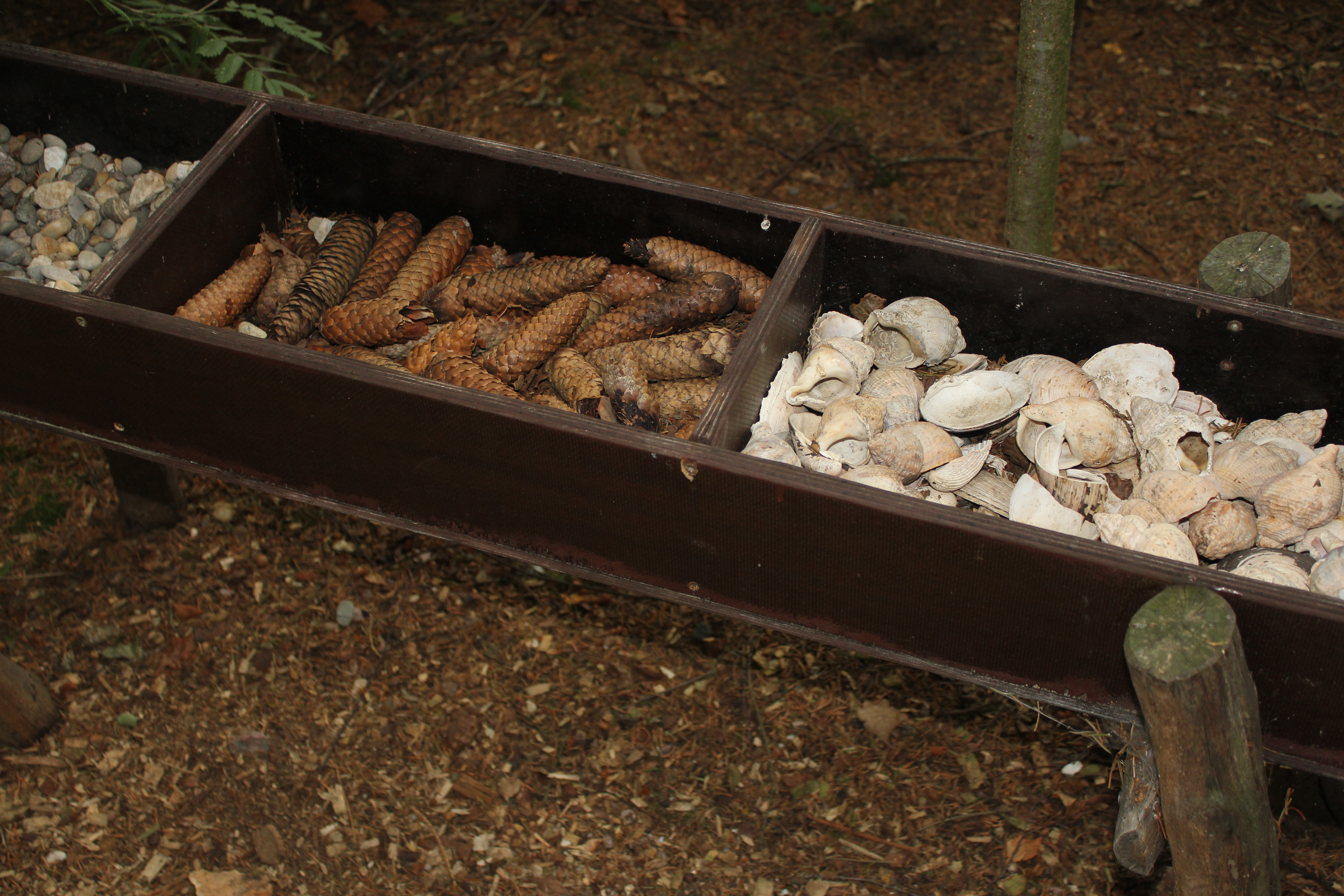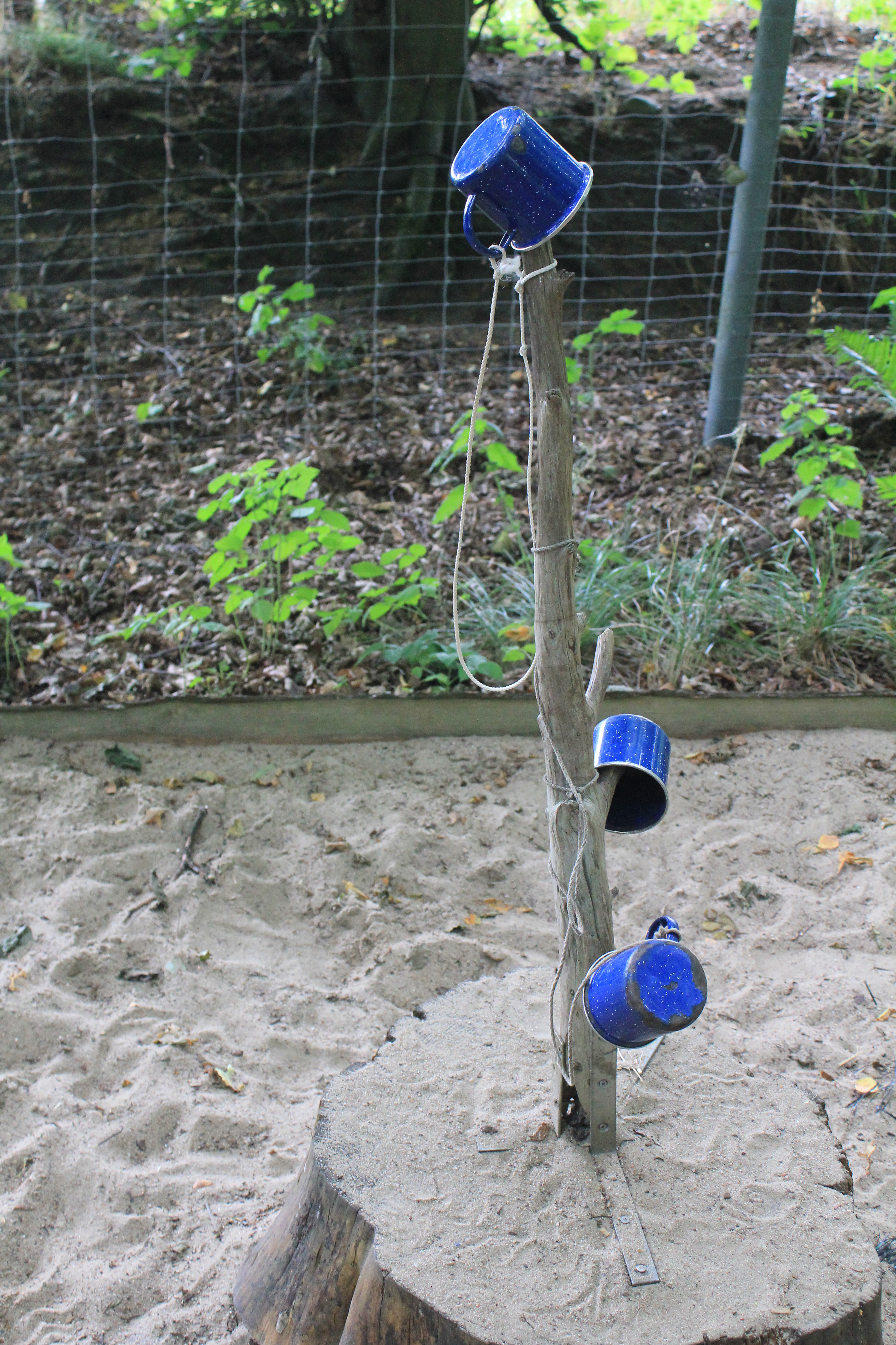 Ich hab keine Ahnung, wie oft die Mädels diese Runde gelaufen sind. Zwischendurch wurden 5 Minuten lange Rekorde aufgestellt im Kneippbecken zu verweilen. Die Fußtrainingstation ein wenig länger benutzt… dort kann man Seile mit den Füßen verknoten, oder Tassen von einem aufgestellten Ast holen. Nicht nur für die Füße ist gesorgt, es gibt auch eine Station wo alle anderen Sinne besonders gefordert sind. Tastkästen für die Hände, Riechkästen mit Schafswolle, Spiegelkästen bei alten Eichen, große Trichter und Schläuche zum genauen Hinhören.