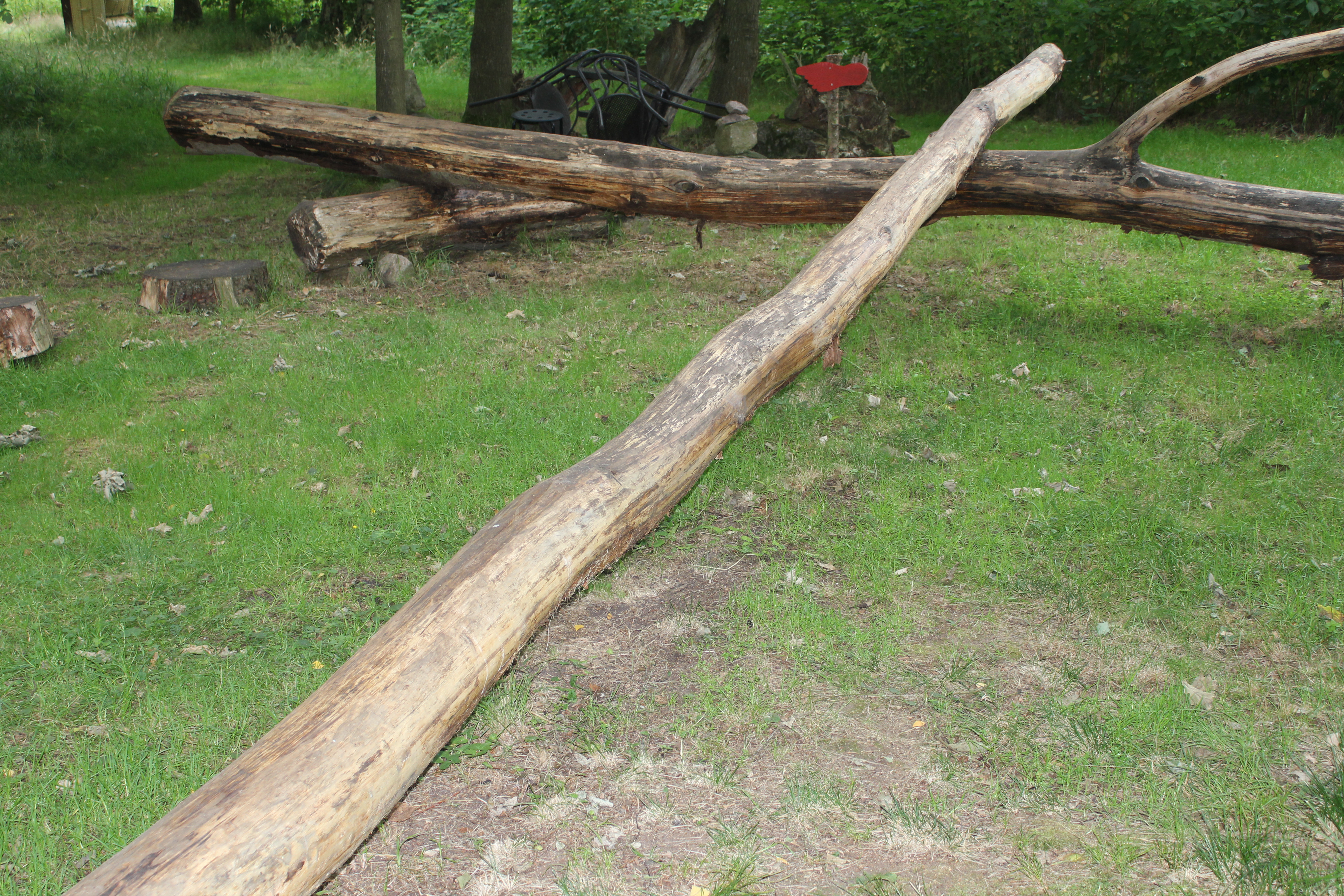 Altes Handwerk wird hier betrieben, Schulklassen und andere Gruppen nutzen das Angebot gerne. So gibt es eine Lehmwerkstatt, eine Holzwerkstatt, eine Feldschmiede, einen Lehmbackofen einige Bauwagen und Häuschen, viele Unterstände, ein zwei Strandkörbe, immer wieder mal eine Bank, eine Trollinsel, einen Wasserspielplatz, ein Baumhäuschen, Riesentrampoline, einen überdachten Heuboden (der sich wirklich auf dem Boden befindet), Meerschweinchen, eine Streuobstwiese, einen Gemüsegarten mit alten Gemüsesorten und einer Kräuterschnecke, einen Balance Balken direkt über den See, eine Seilüberquerung auch über den See, auf dem man übrigens mit zwei Booten fahren kann und drei Mopshunde, die sich supergerne von den Kindern streicheln lassen.