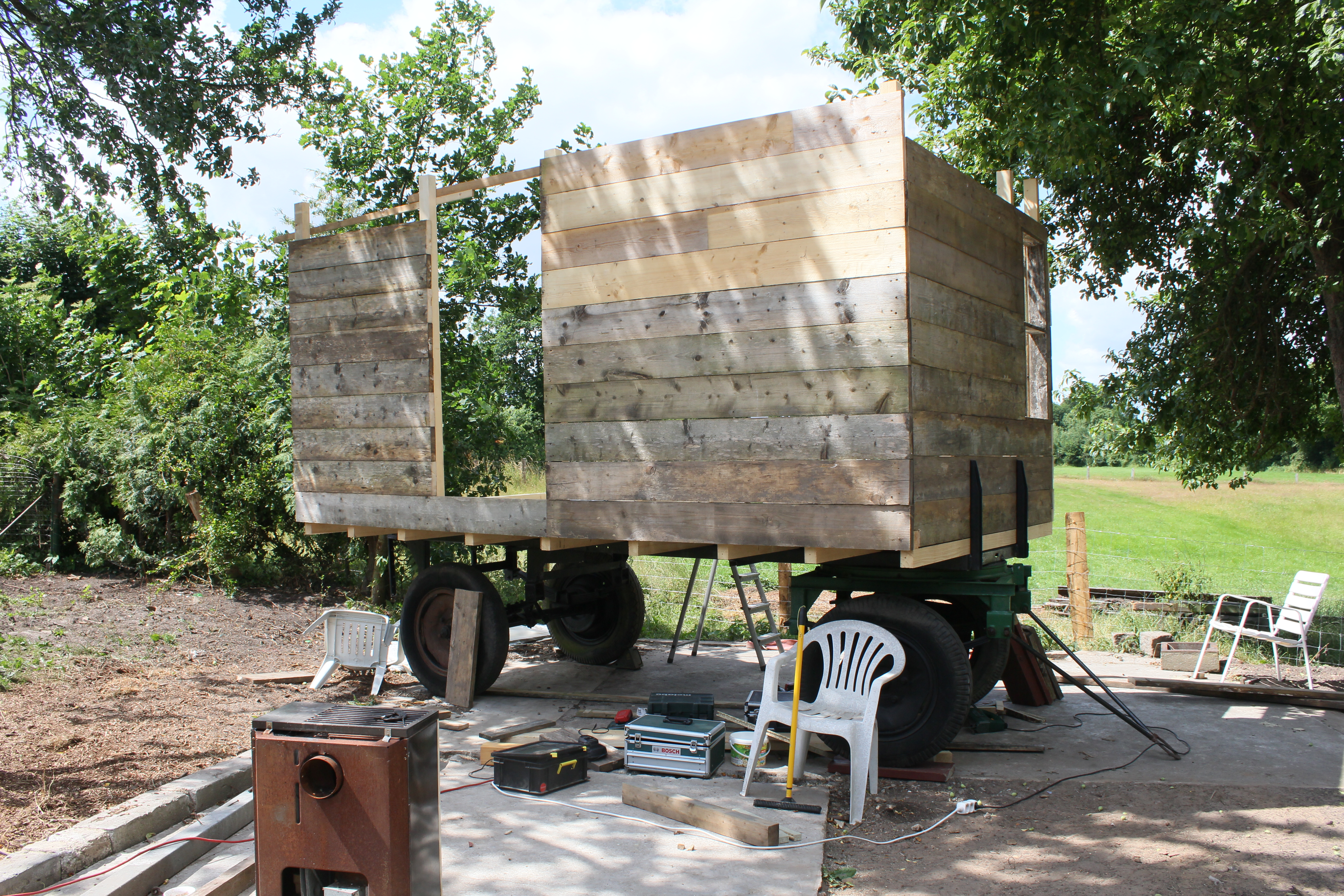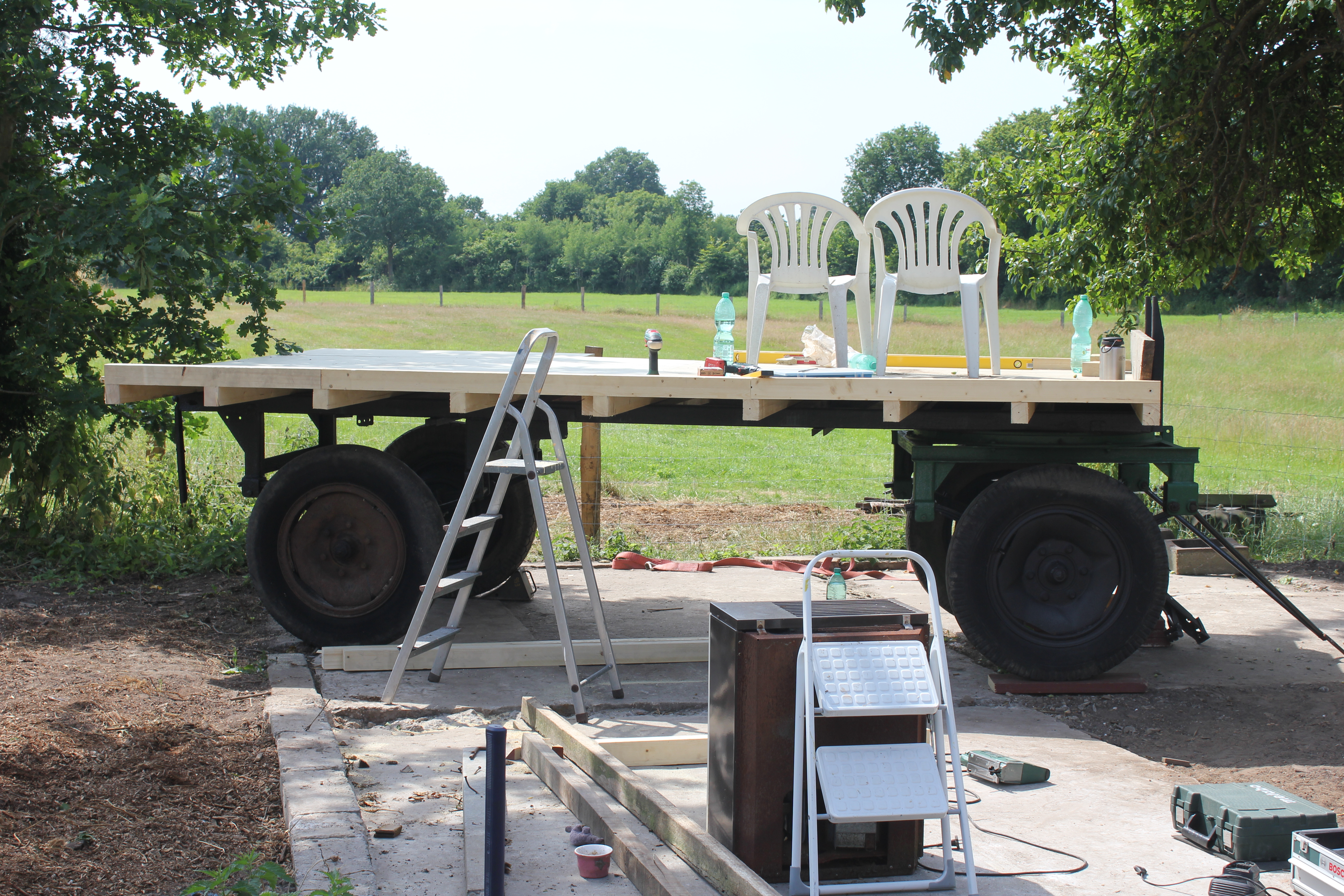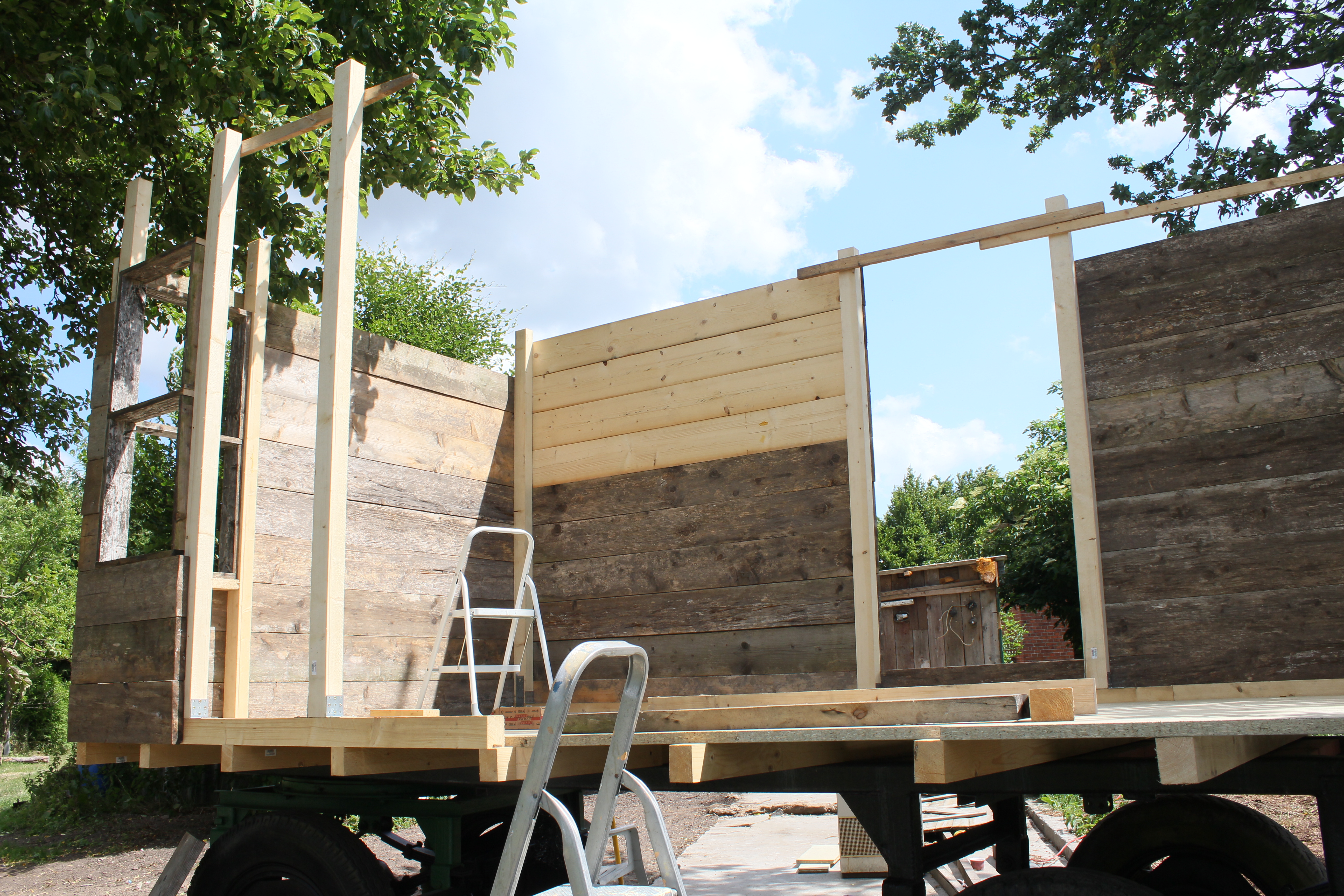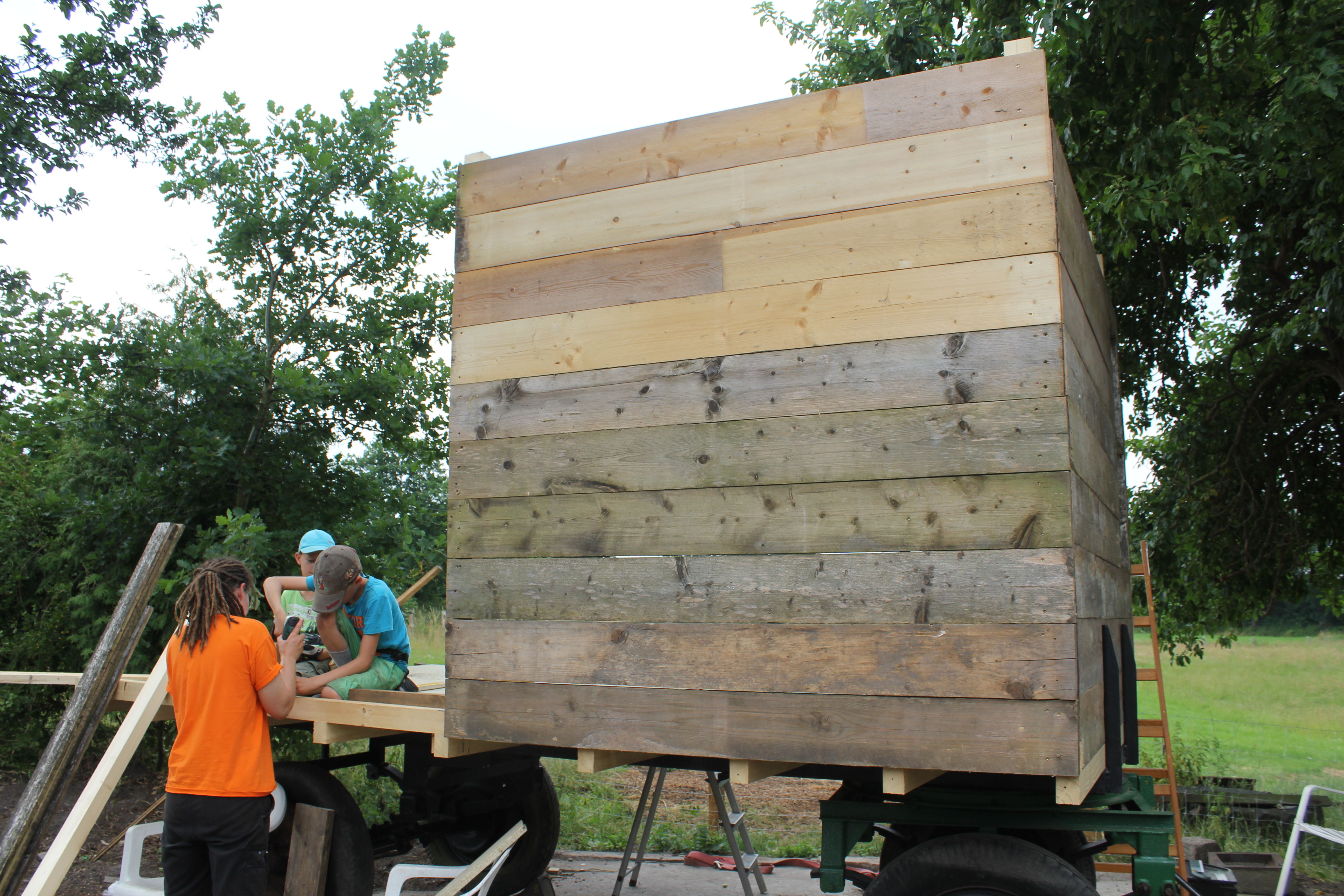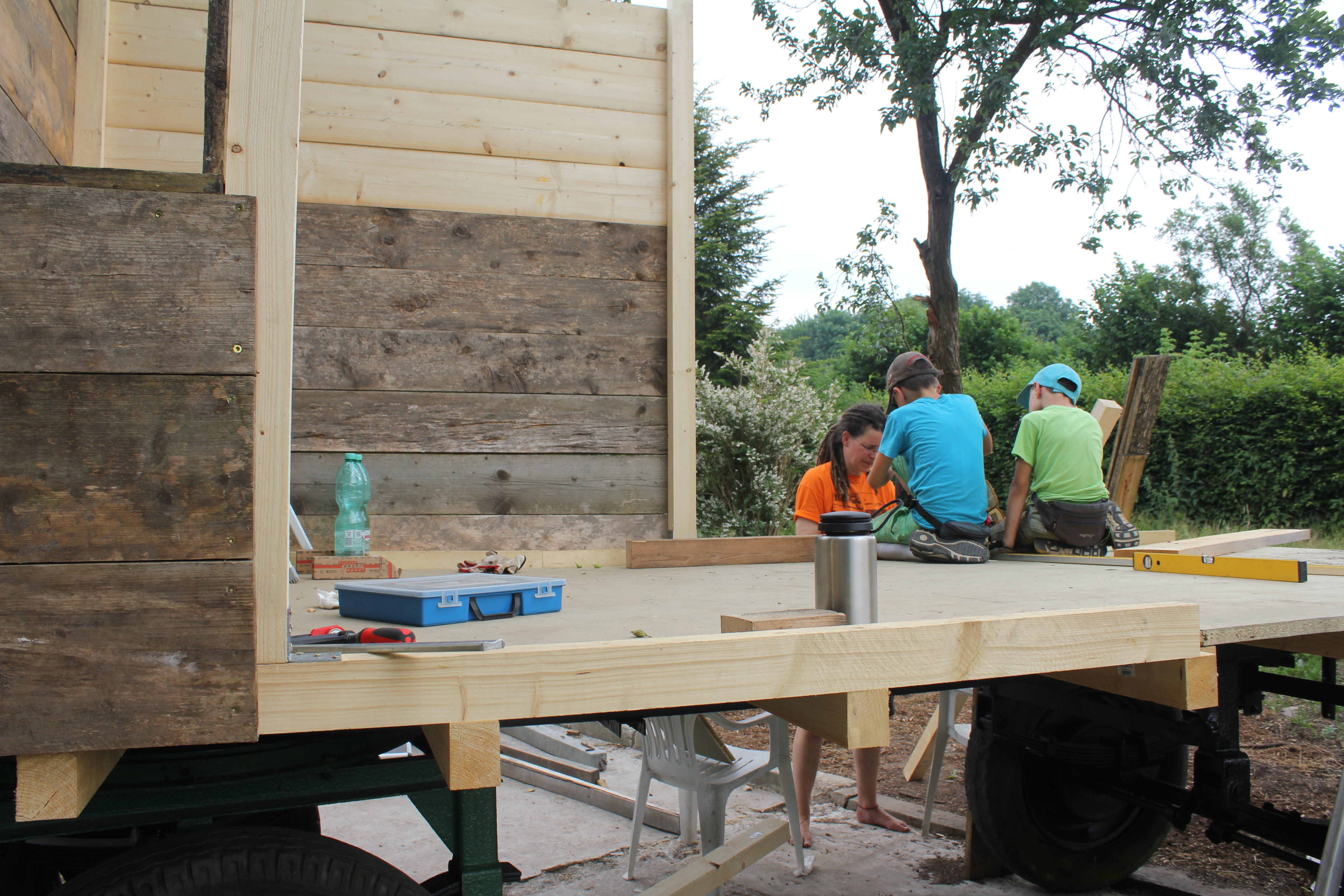 Éine Woche waren die Jungs hier, meine Neffen 10 und 8. Geplant war dieses Jahr, dass wir auf das Traktorhängergestell, dass wir geschenkt bekommen haben, einen Wohnblock draufsetzen. Also einen Bauwagen basteln 🙂