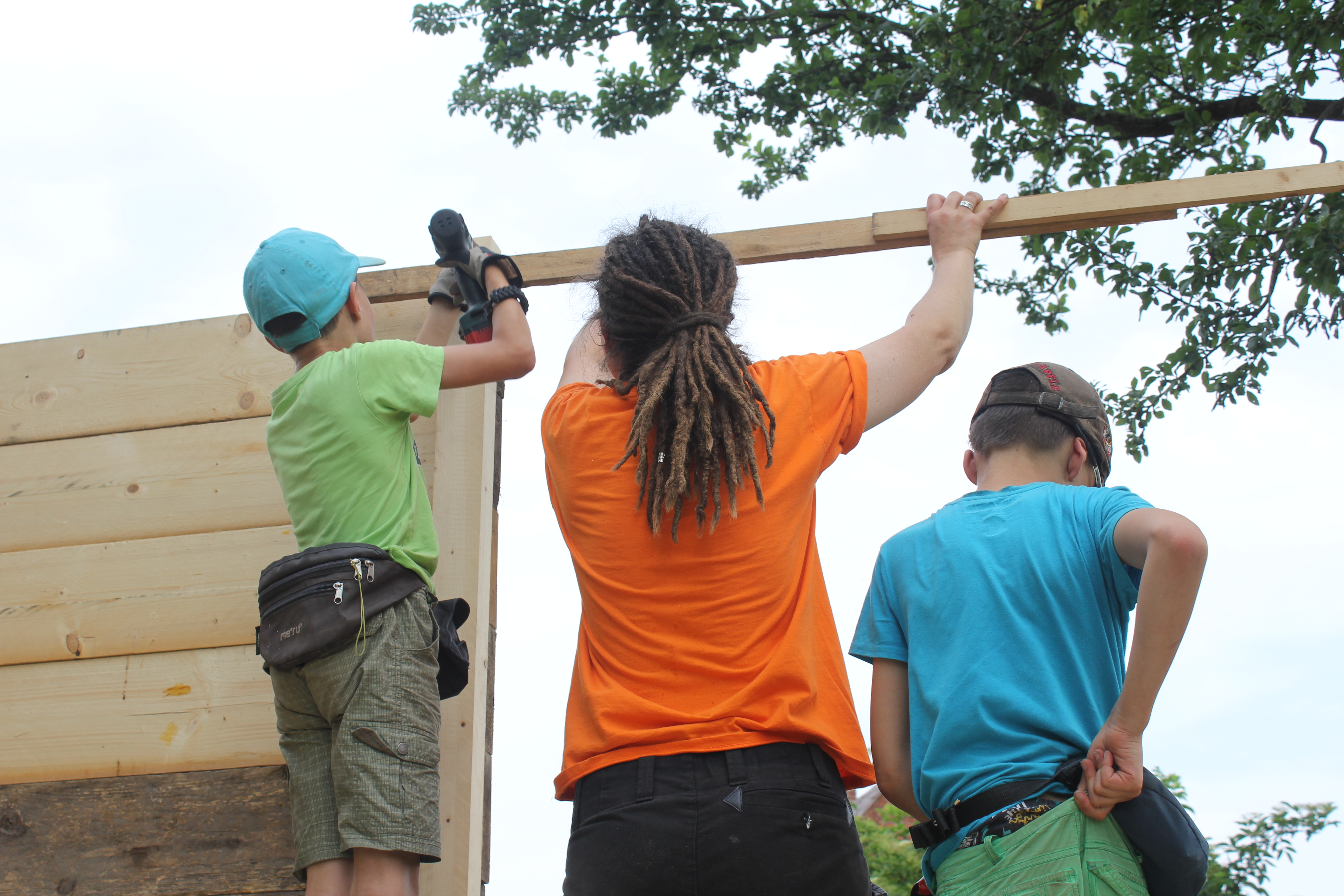 Natürlich gabs zwischendurch auch mal Streitereien, wer denn jetzt den Winkel anschrauben darf, oder wer welchen Akkuschrauber mit welchem Bithalter benutzt. Das klärte sich aber meistens recht schnell. Ihre Fertigkeiten werden jedes Jahr genialer. Vorletztes Jahr hatten sie mit der Stichsäge erste Erfahrungen gemacht, dieses Jahr war das geradeaus sägen kein Problem mehr. Sie haben mehr Kraft und helfen sich gegenseitig hoch oben auf der Leiter stehend eine Schraube in die Bohle zu drehen. Einer steht vorne auf der Leiter mit Akkuschrauber und Schraube der andere hinten auf der Leiter und drückt im richtigen Moment mit voller Kraft. Klar reicht das nicht immer, je höher es ging um so schwieriger wurde das. Aber dann war ich ja auch noch da.